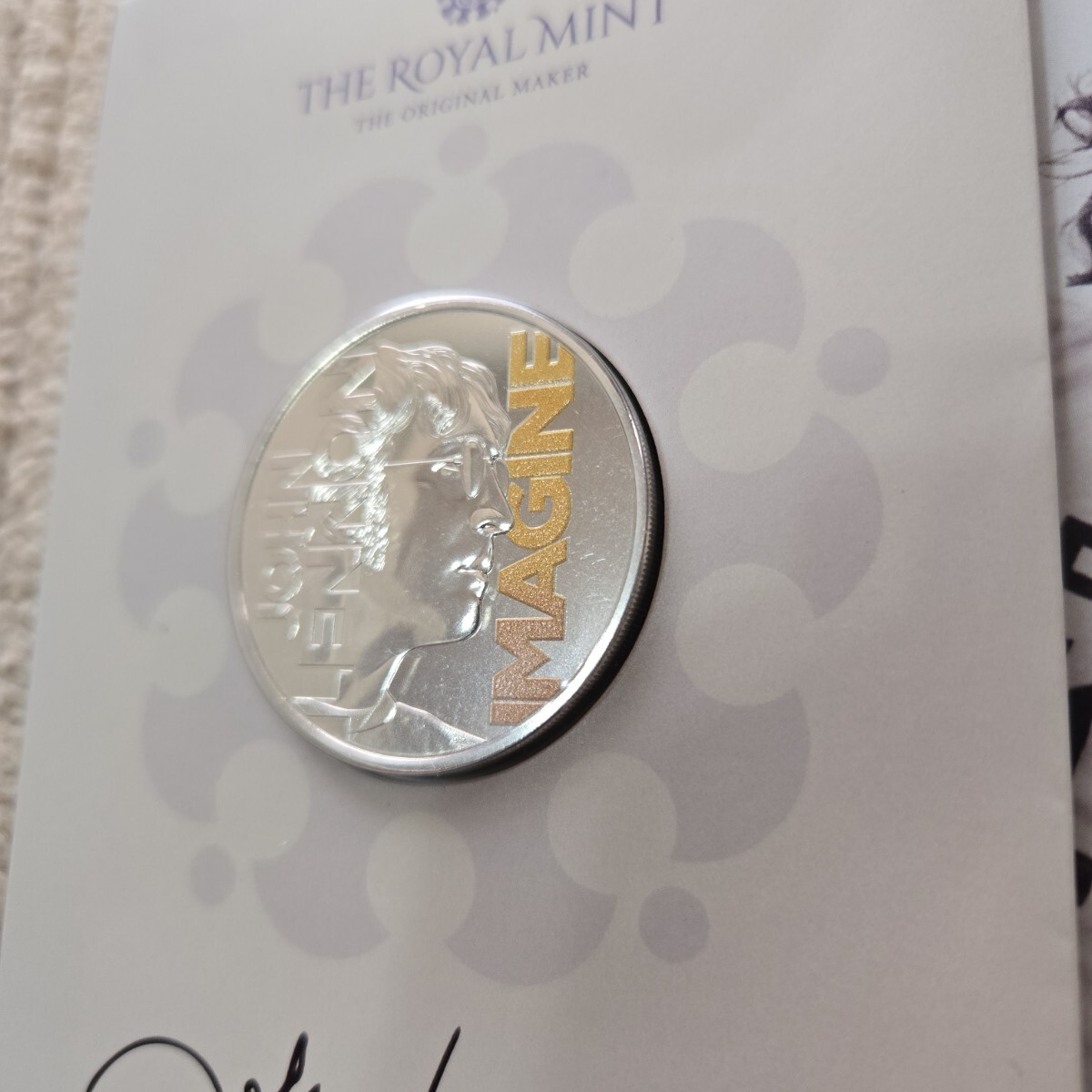 今回のコインは、裏面をヘンリー・グレイがデザイン。ボブ・グルーエンが撮影した、「New York City」のTシャツを着たジョンの横顔が描かれ、「JOHN LENNON」と「IMAGINE」の文字が添えられています。