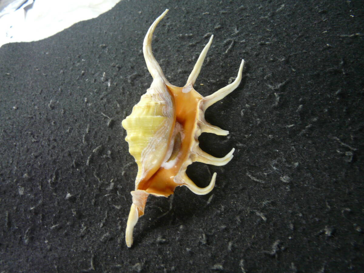 マルケサス産のピルスブリーサソリ、116.5㎜です。サソリガイのマルケサス方面のフォームで、指状突起が非常に長く伸びます。しかし、この個体は水管部に破損があります。