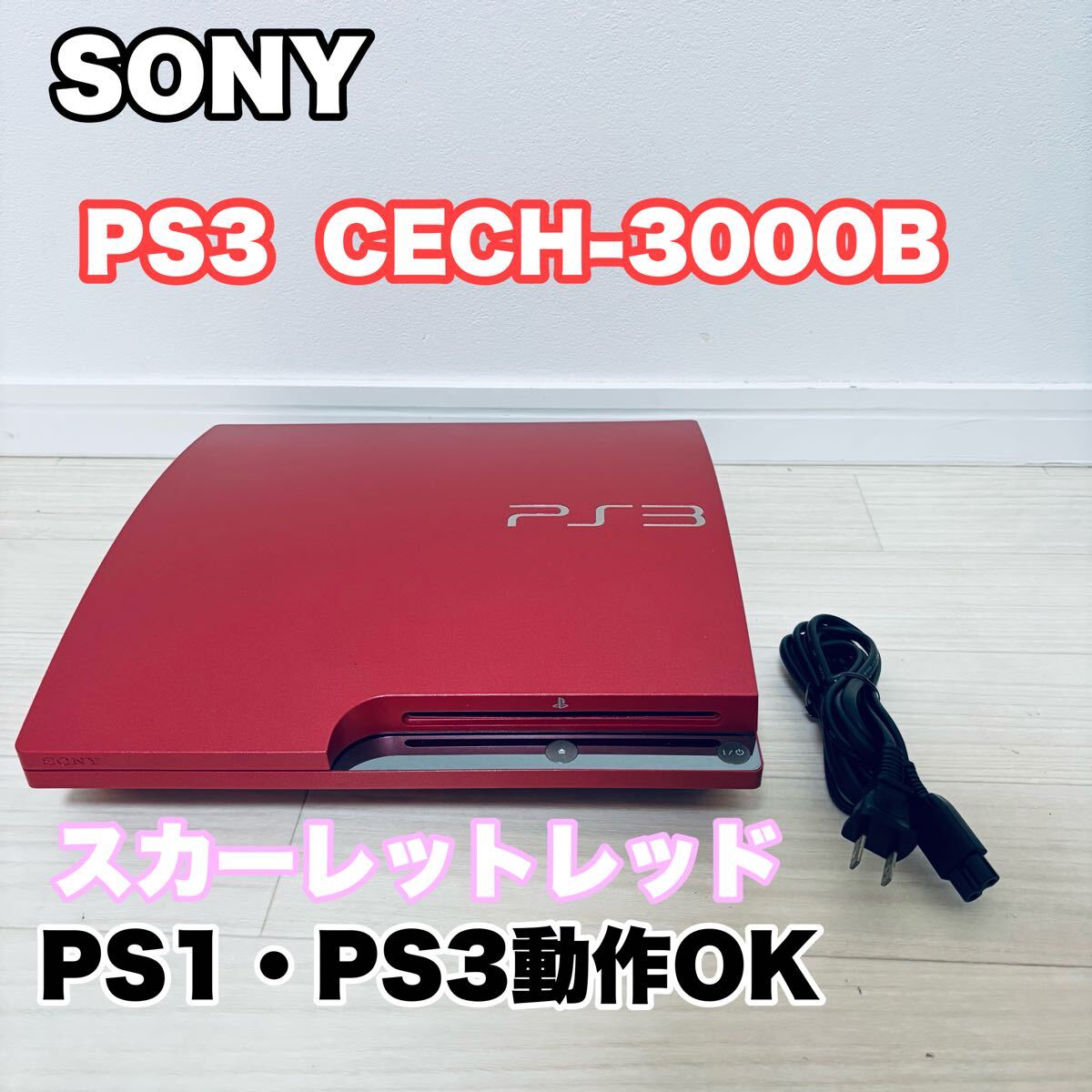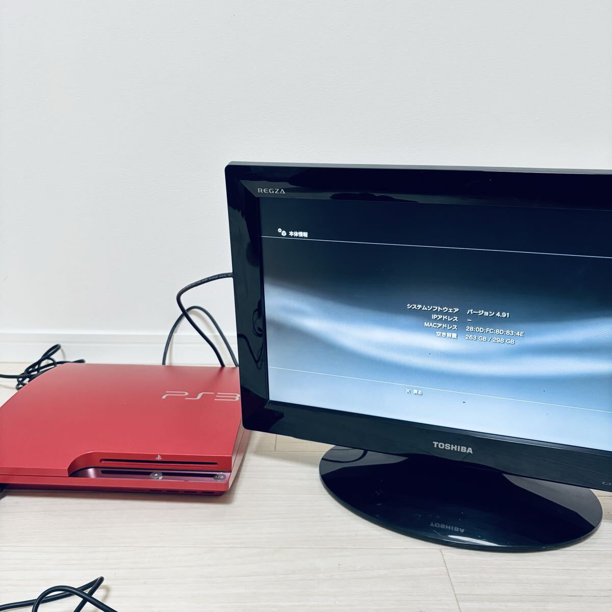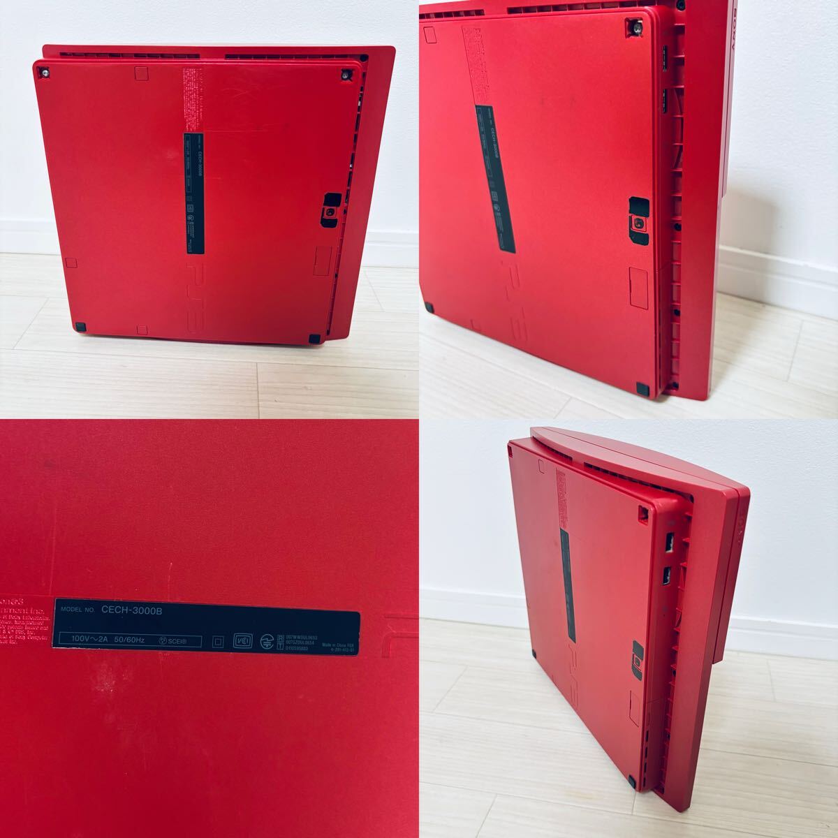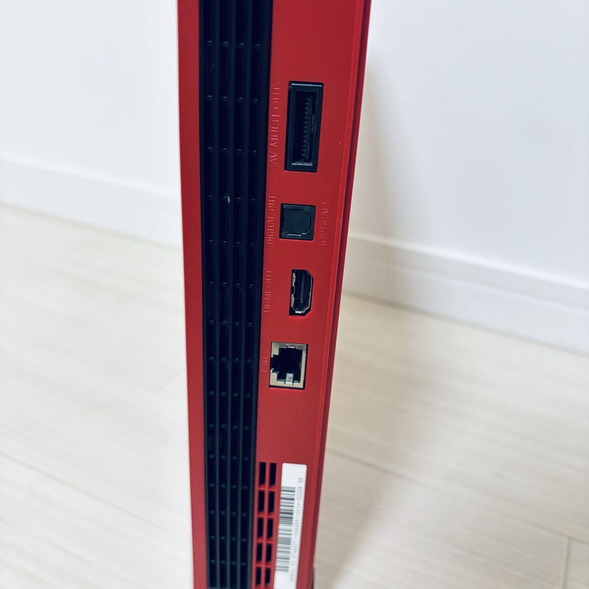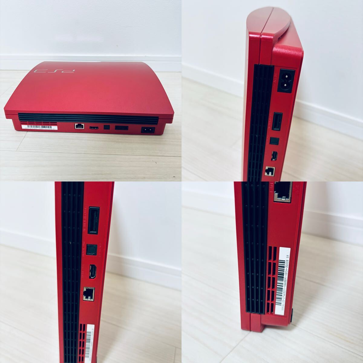 鮮やかなレッドのPS3本体、電源ケーブル付き。