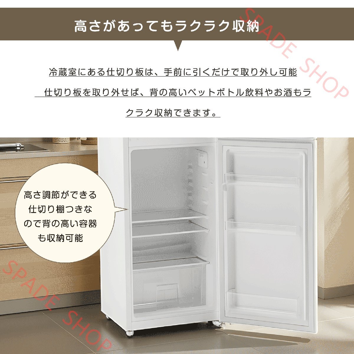 • 【冷蔵+冷凍、2ドア構造で使い分けができて便利!】 冷凍食品・ドリンク・作り置きなど、必要なものだけをコンパクトに収納。一人暮らしはもちろん、二人暮らしのサブ冷蔵庫にも最適