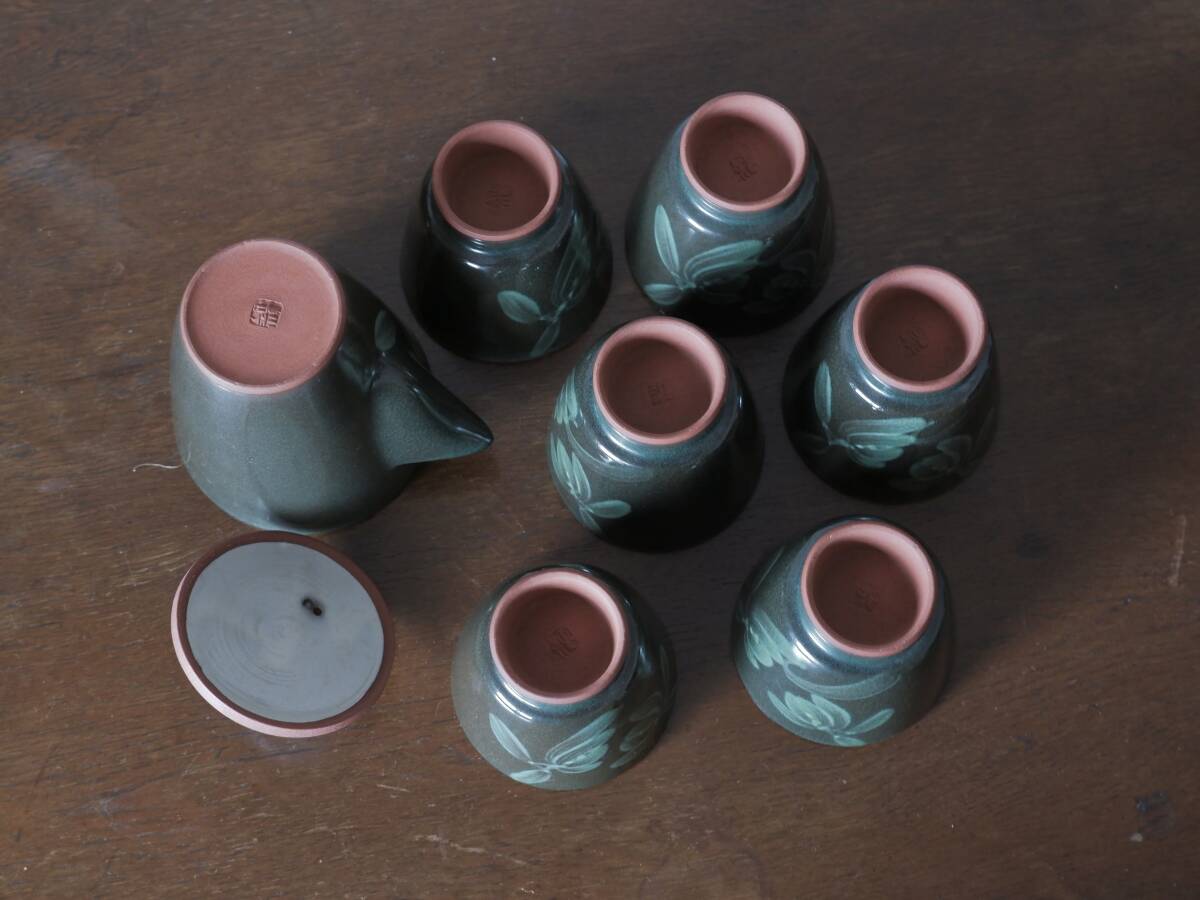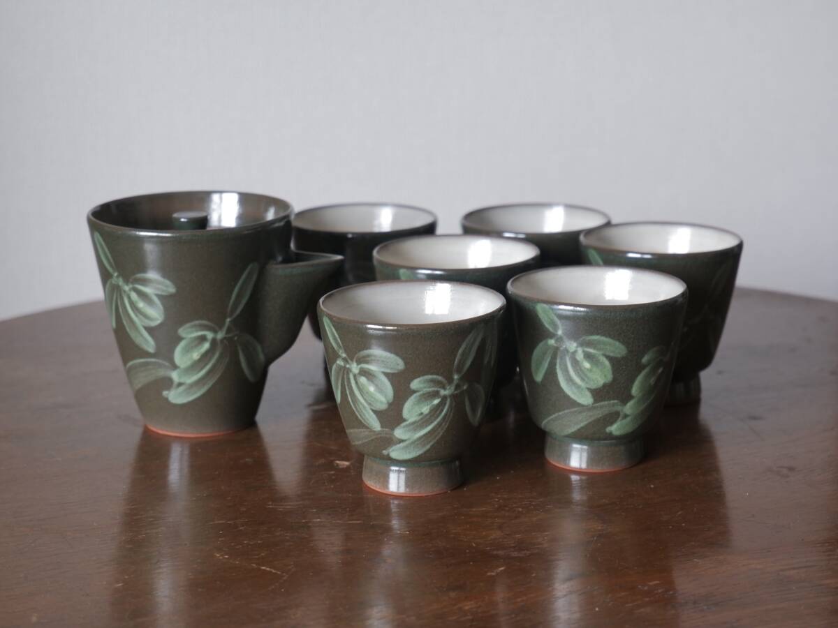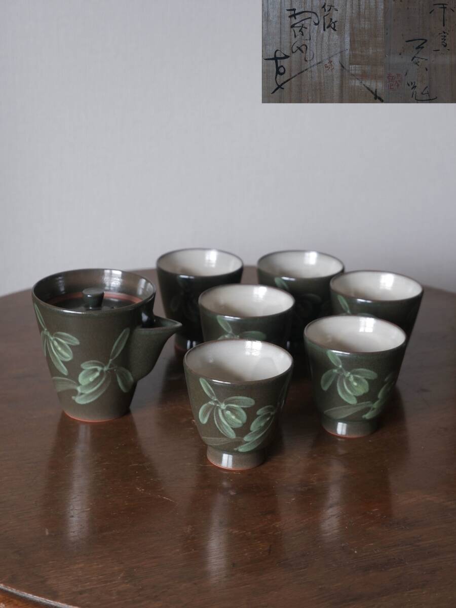 【青枠】人間国宝 三浦小平二 佐渡無名異焼 湯飲み 深緑釉蘭 宝瓶/茶碗 7点セット 茶道具 共箱付 時代物 美術品Q2018
