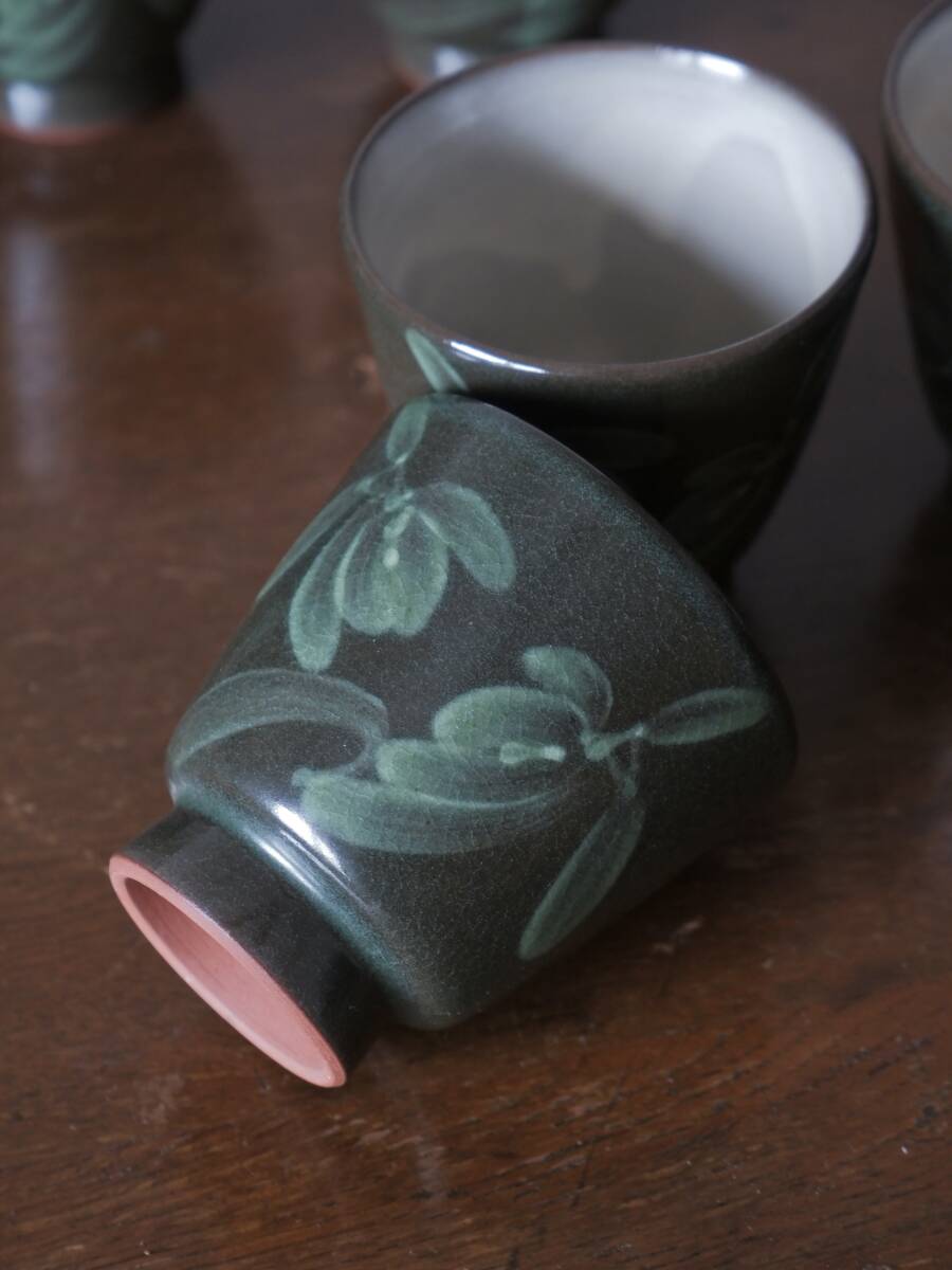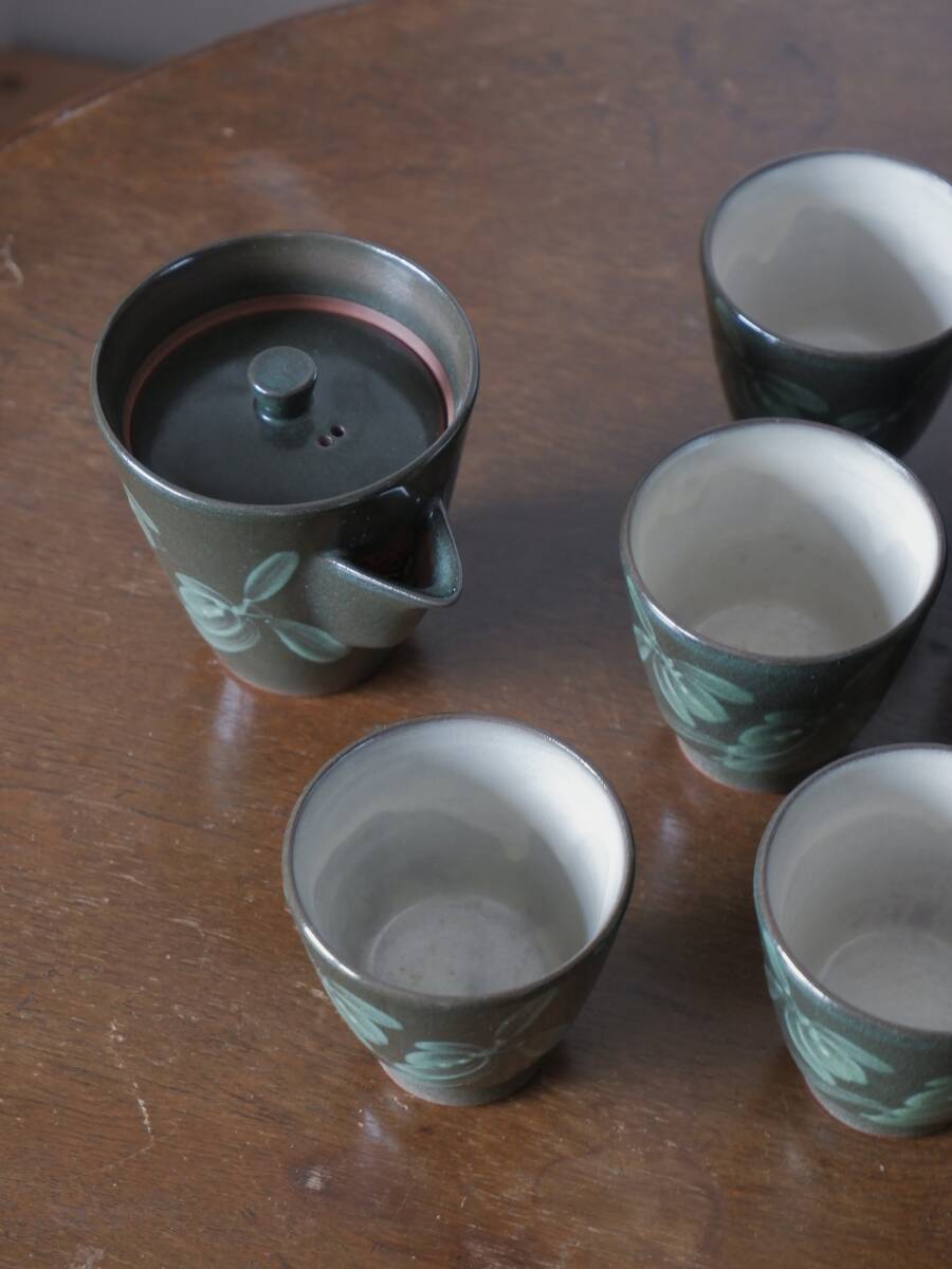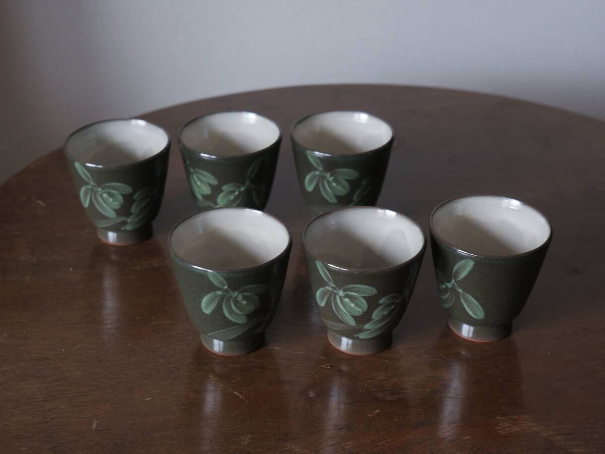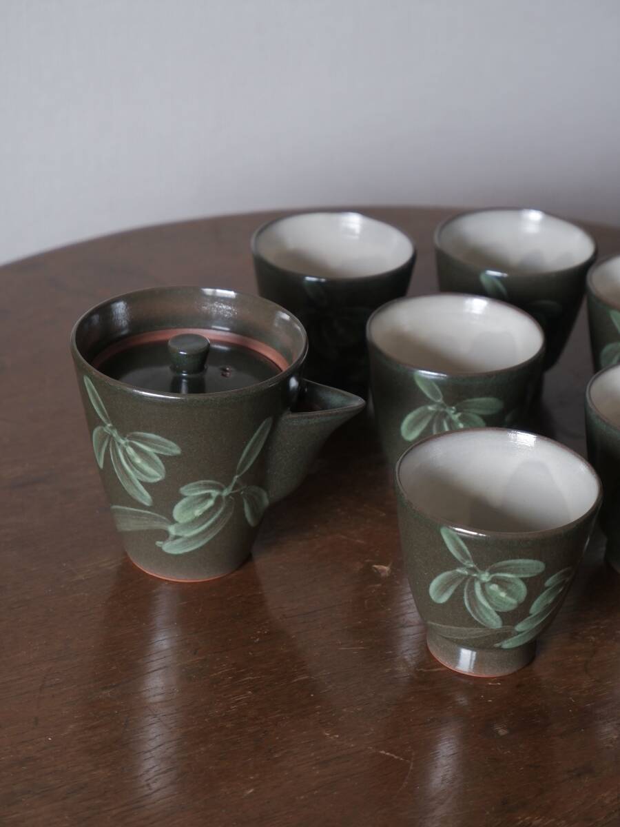 【青枠】人間国宝 三浦小平二 佐渡無名異焼 湯飲み 深緑釉蘭 宝瓶/茶碗 7点セット 茶道具 共箱付 時代物 美術品Q2018