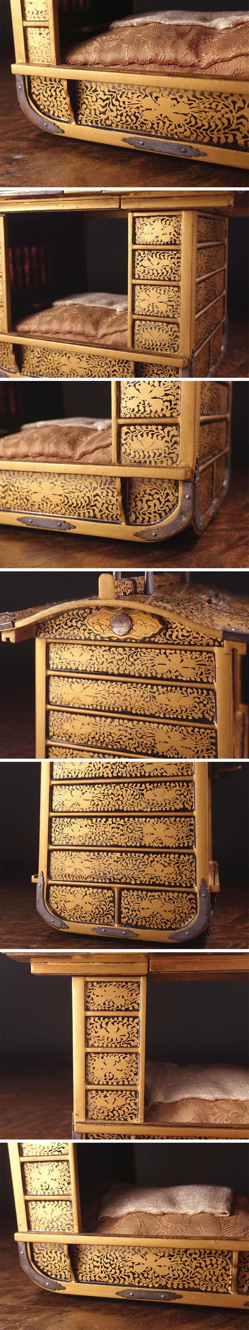 いわゆる七澤屋物に属する雛道具で、江戸時代に身分の高い女性が婚礼に用いらことから女乗物とも称される駕籠をミニチュアにて表現しており、全体に大の字牡丹唐草文をあしらった高雅な意匠を特徴とし、漆黒と金蒔絵の美しいコントラストが雅やかな気品を醸し出しています。