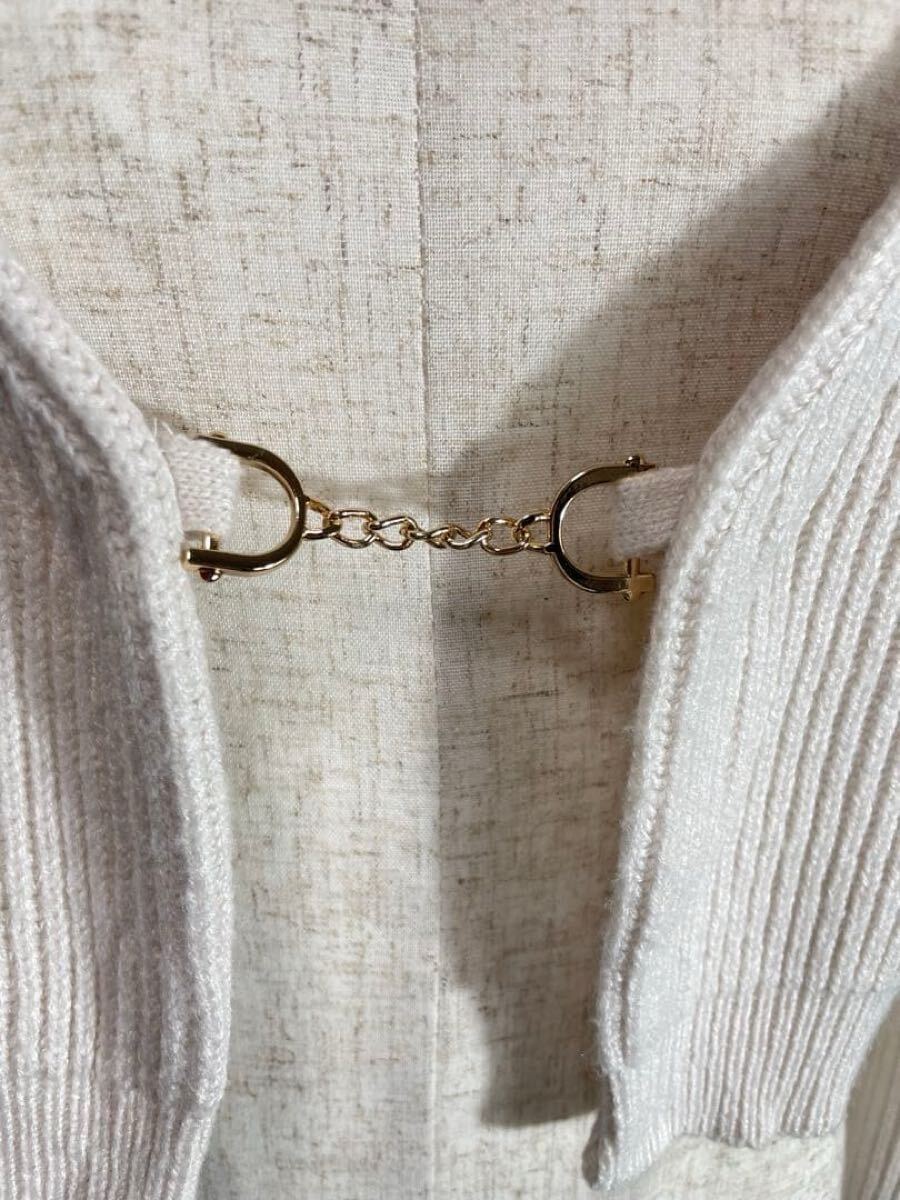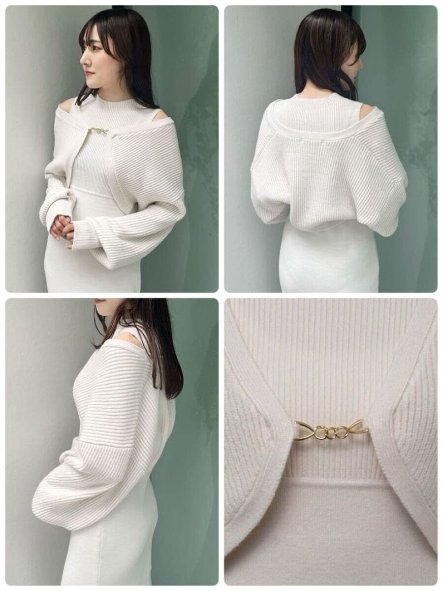 チェーンがポイントになったローゲージカーデと、マーメイドニットワンピースがセットになったアイテム。