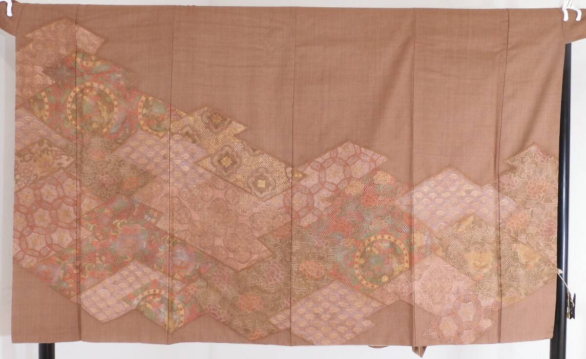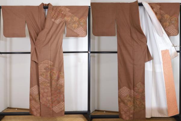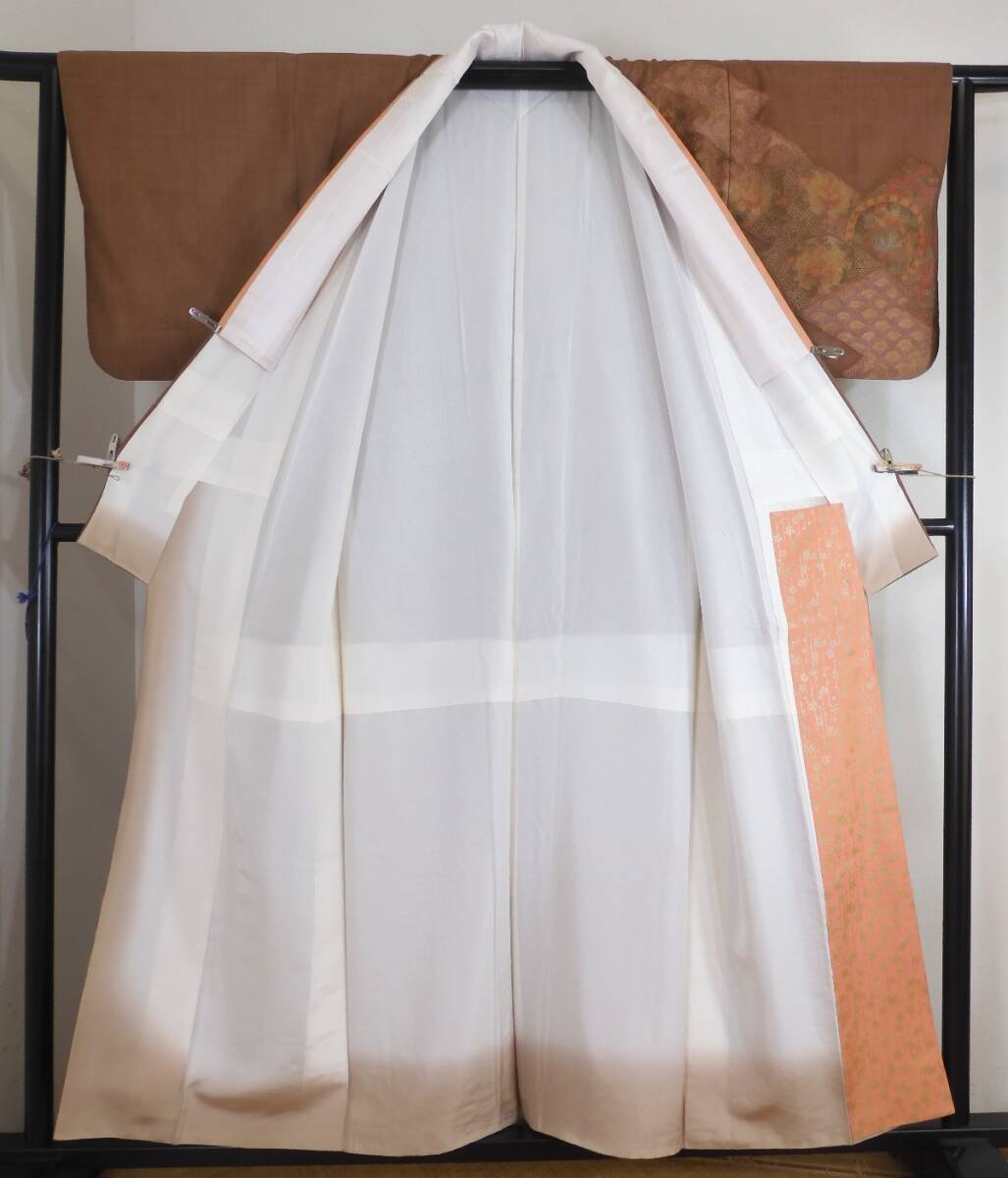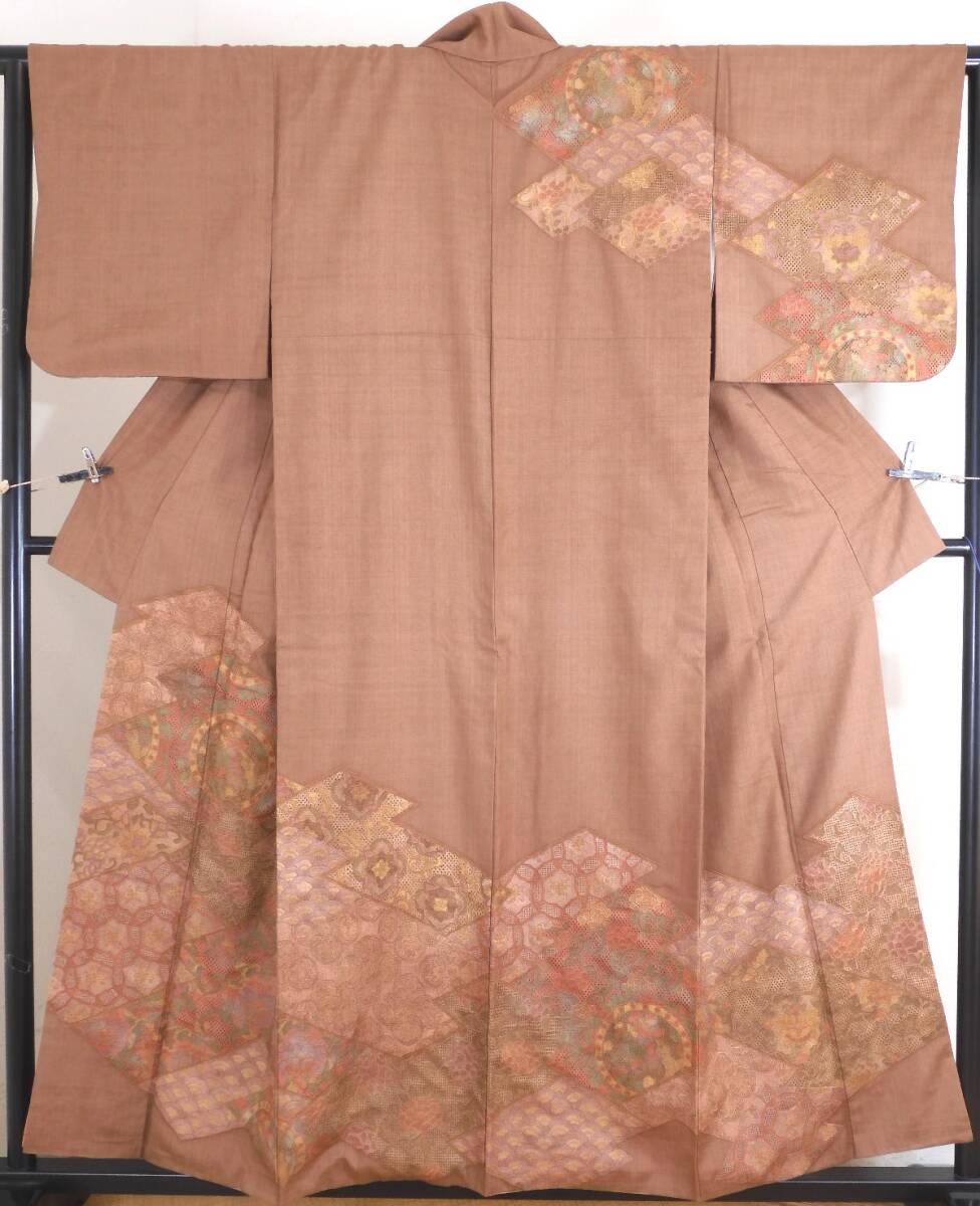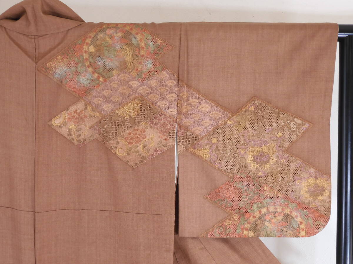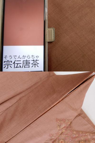 <銀の斧>正絹・逸品・大変緻密・芸術 汕頭刺繍紬地訪問着・結城紬・和名 宗伝唐茶色