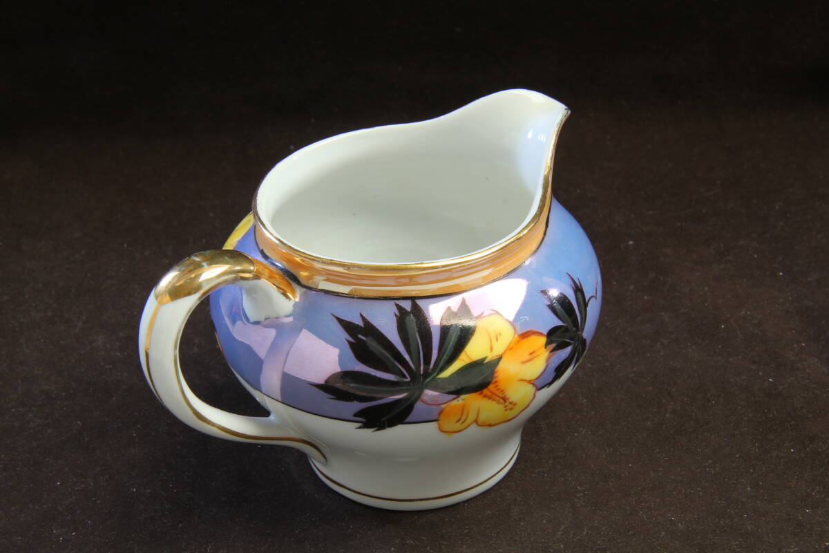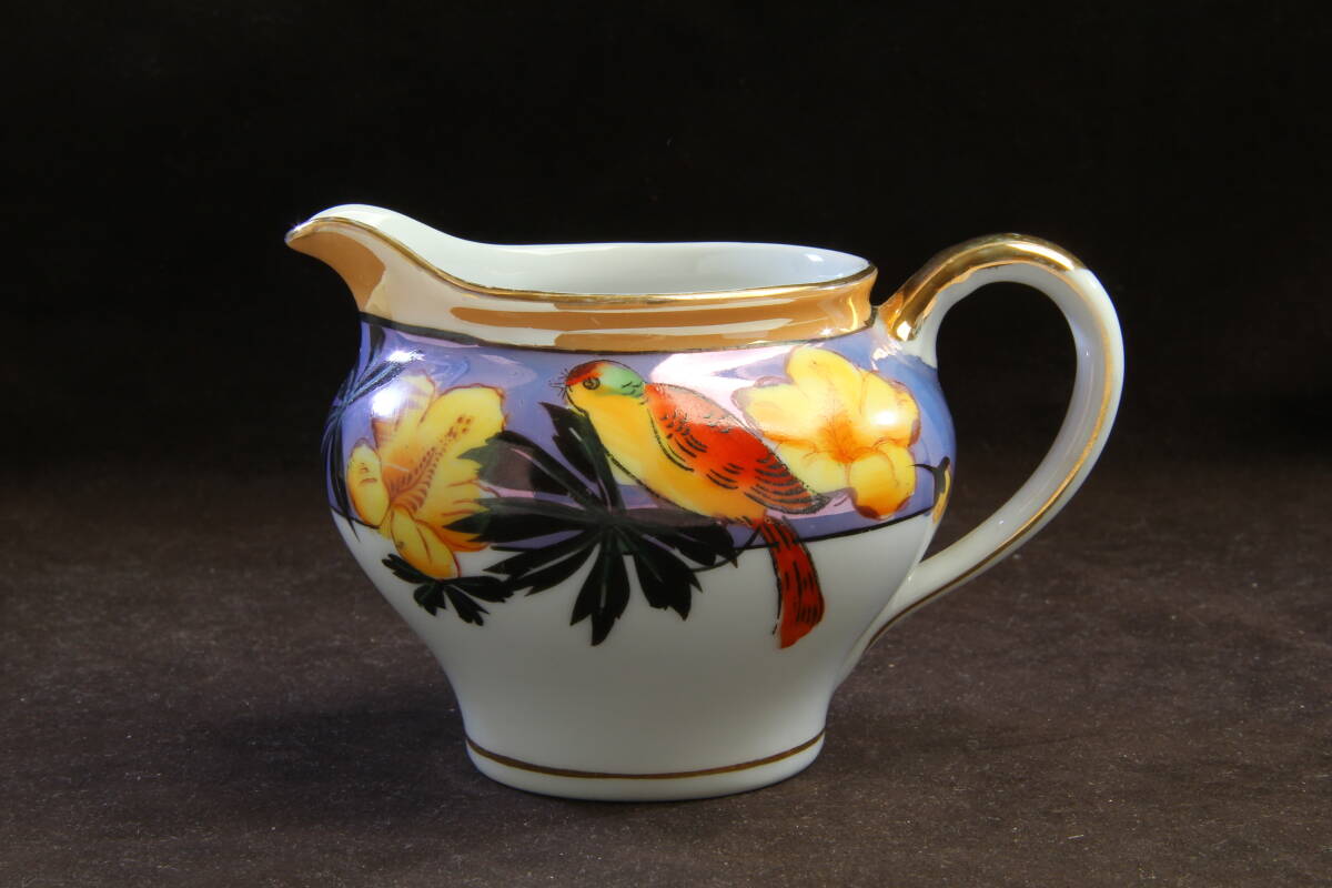 金彩で縁回りを飾り、ラスターの下地に 花鳥の絵柄を描いた 美しいハンドル付き クリーマー