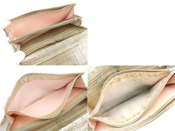| コンディション | 全体の状態詳細:使用感がありますが、まだまだお使いいただけます。スレ 汚れ 角スレ ラメカラーハガレ 金具キズ 黒ずみ&シミ(小銭入れ&ポケット内) キレ(角内側) コバハガレ&接着ハガレ(ファスナープル革付け根) など使用感があります。 |