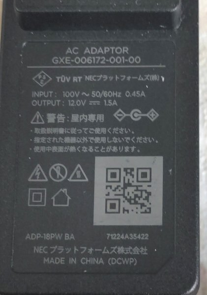 ★NECプラットフォームズ ACアダプター GXE-006172-001-00 ADP-18PW DC12V 1.5Aセンターピンあり 動作OK