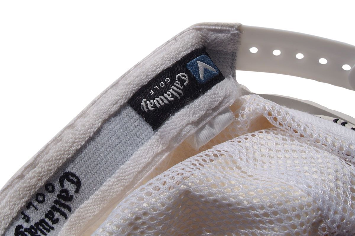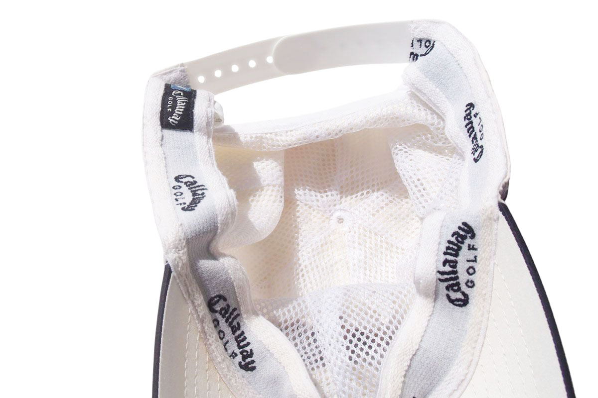 内側には吸汗速乾性に優れたメッシュライニングとブランドロゴ入りのスベリを配し、長時間のラウンドでも快適な着用感をキープします。