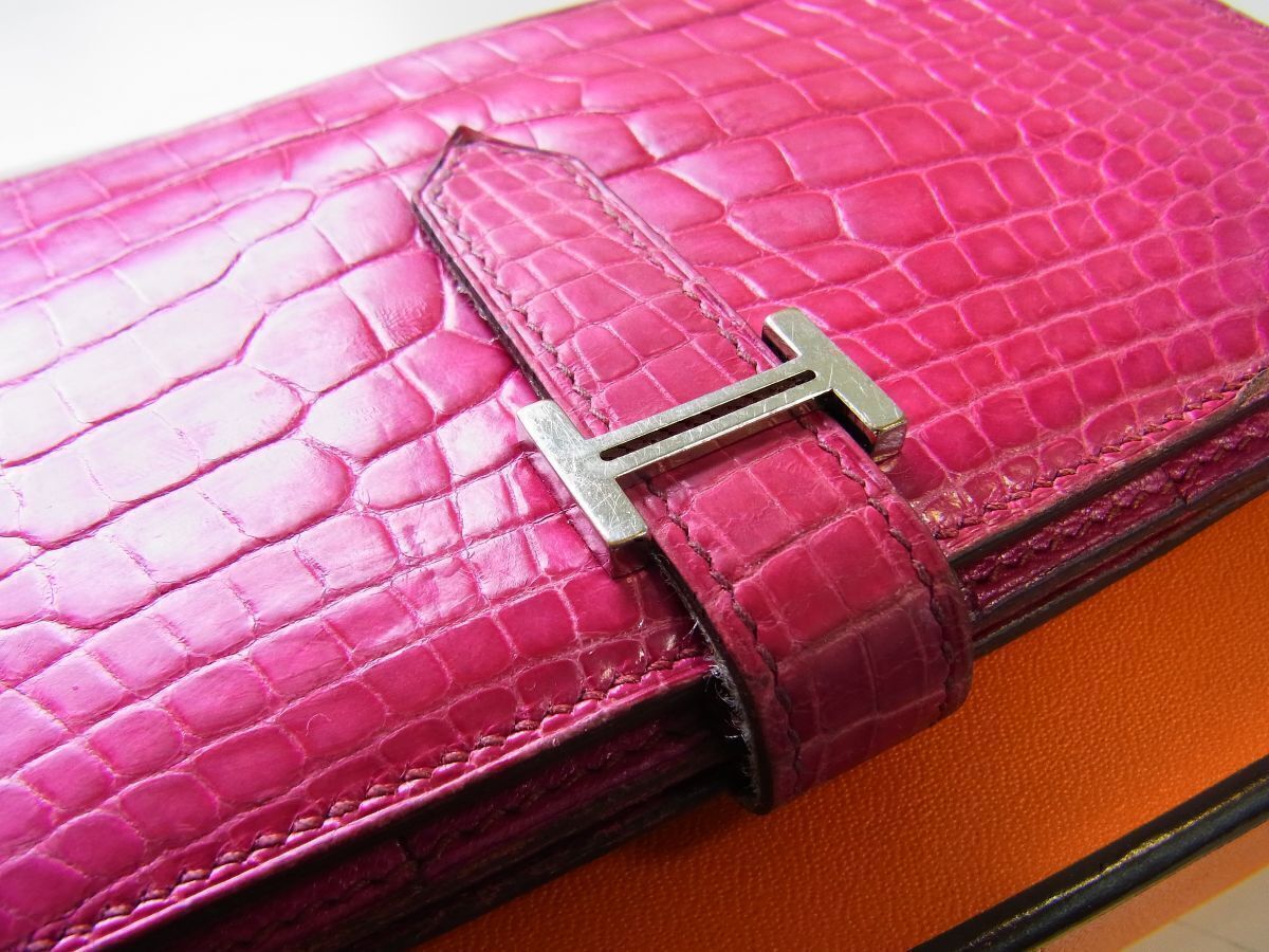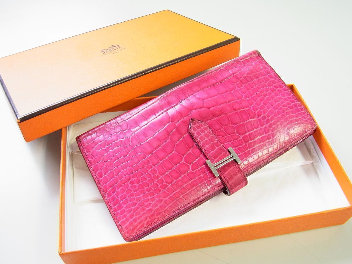 中古★ HERMES エルメス★長財布 ベアン アリゲーター★ローズシェヘラザード★クロコ長財布★箱付本物金運★本革クロコダイル【本物保証】