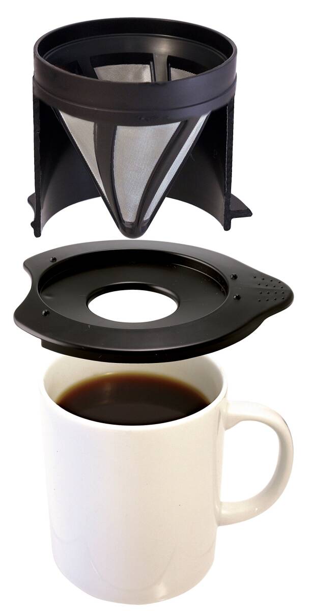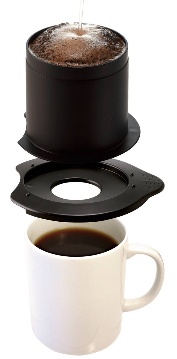 説明 商品紹介 ペーパーフィルター不要のワンカップ専用ドリッパー より ●マイカップで使える『ペーパーレスドリッパー』 ●ペーパー不要で本格アロマ ●ペーパーフィルターを使わず、そのままドリップできる。コーヒーの旨み成分のひとつであるコーヒーオイルが抽出できる特殊ステンレスメッシュを採用した。コーヒー本来の独特なアロマを楽しめる ●様々なサイズのカップに対応 アタッチメント付きなので、お手持ちのマグカップに合わせて使える。口径5~10cmのカップに使用できる ●ドリッパーの内側には目盛りが付いてる ●ドリッパーの裏側から水をあてれば珈琲粉が簡単に洗い流せる