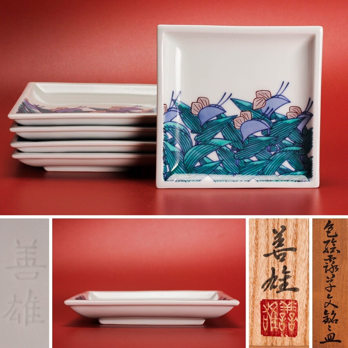 今泉善雄(十四代 今泉今右衛門の兄) 色絵露草文銘々皿 五客 共箱 本物保証