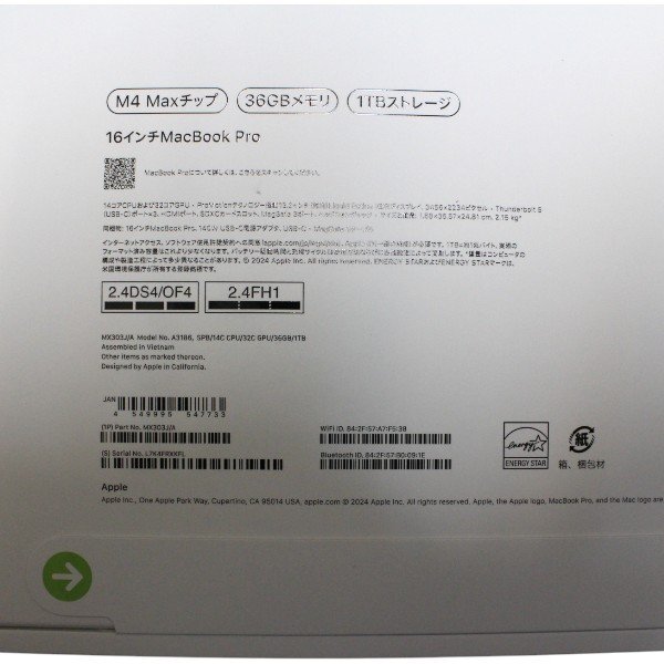 | 商品名 | MacBook Pro Apple M4 Max 16インチ 36GB 1TB |