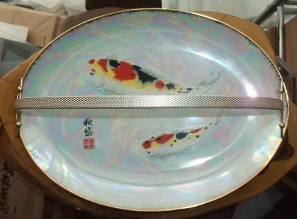 商品説明ー秋岱作双鯉図楕円形のお皿取って付。サイズー縦ー22cm。横ー31cm。高さー3.5cm。取って天迄ー15cm。他に付属品は在りません。写真でのご検討よろしくお願いいたします。オークション終了後速やかにお知らせします。