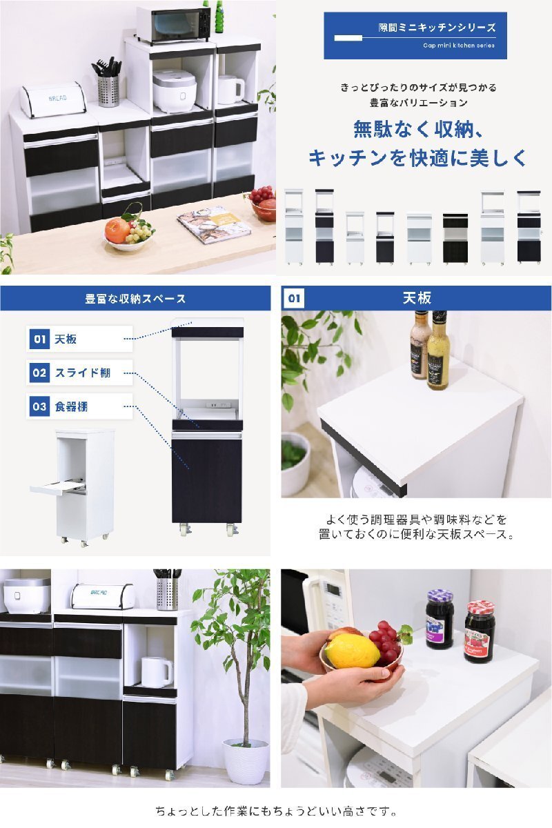 | ■商品説明 家電の収納に便利なコンセント付きスライド棚と、収納物に合わせて高さ調節ができる可動棚付きの食器棚をこれ1台で。ロータイプは天板も使いやすいちょうど良い高さ。キッチンのちょっとした隙間に設置すれば、それまでのデッドスペースを有効活用できます。 |
