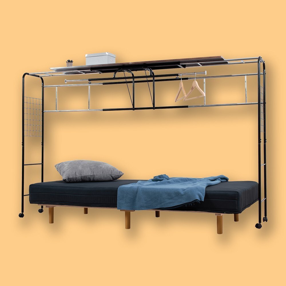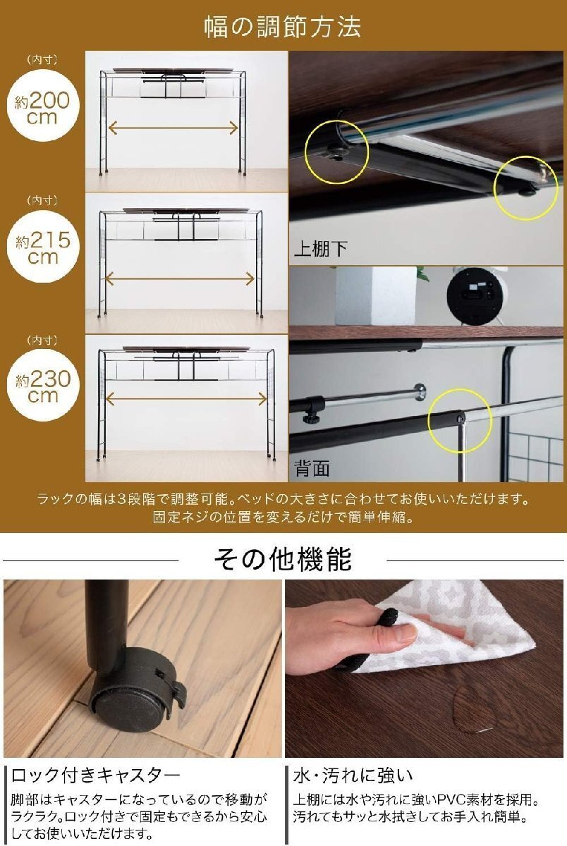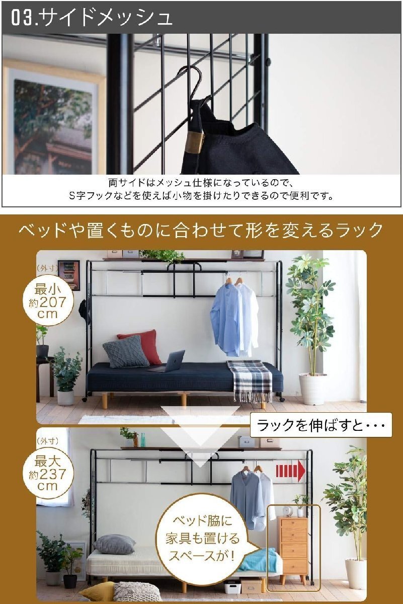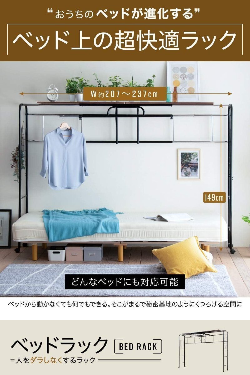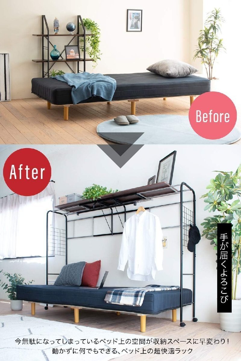 | ■商品説明 おうちのベッドが進化する、"人をダラしなくするラック"。幅を3段階で調節できるので、今お使いのベッドにもプラスすることが可能です!無駄になってしまうベッド上の空間をハンガーラックや上棚などで有効活用できます。 |