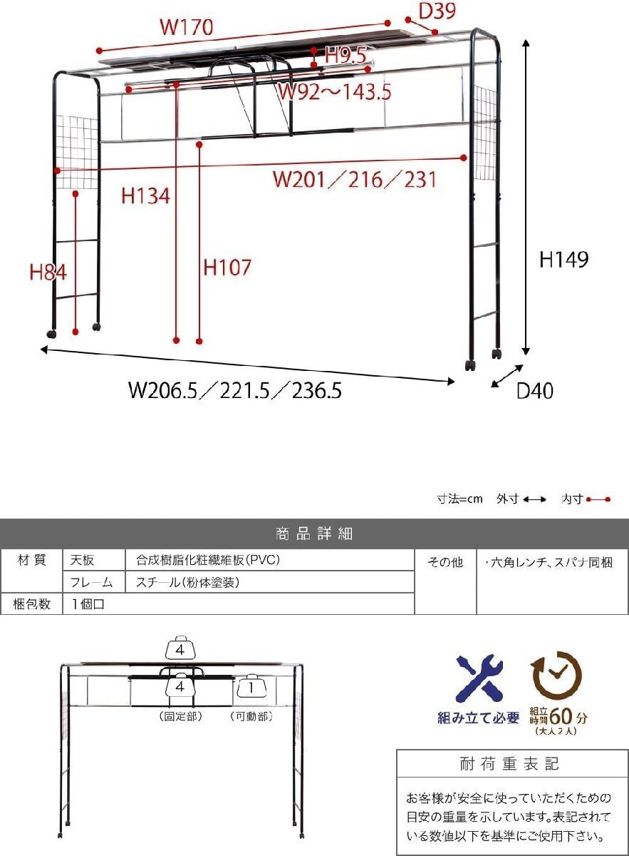 | ■本体サイズ [外寸]幅206.5/211.5/236.5×奥行40×高さ149cm |