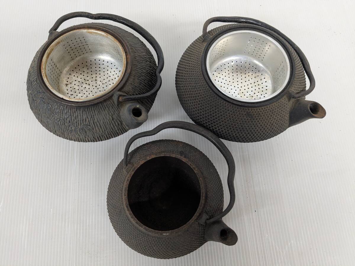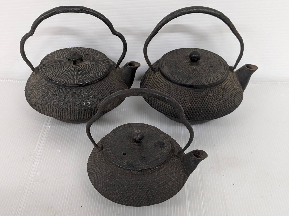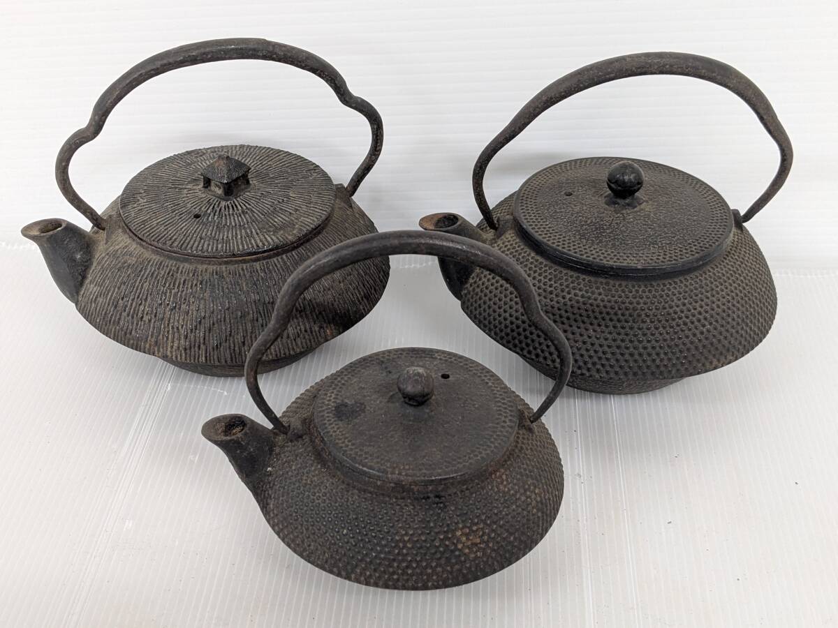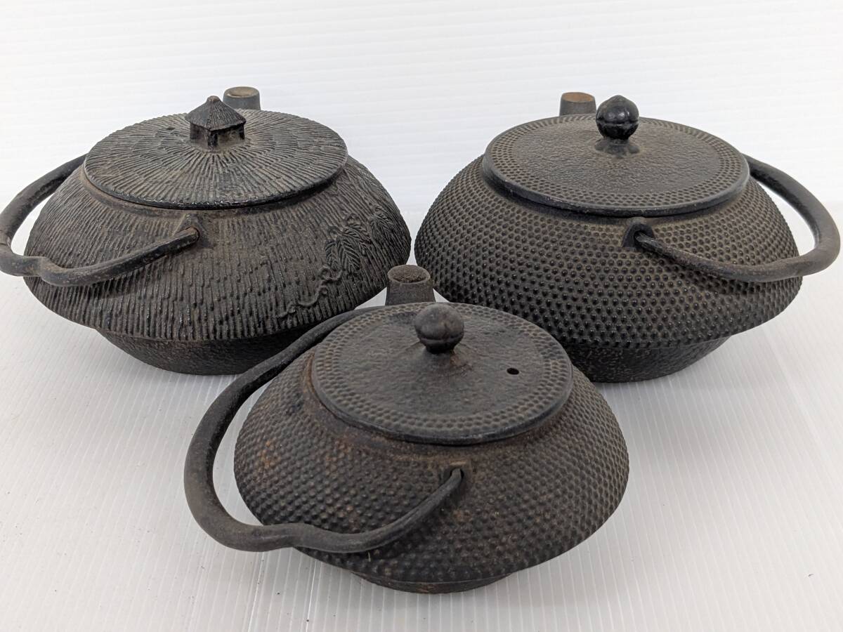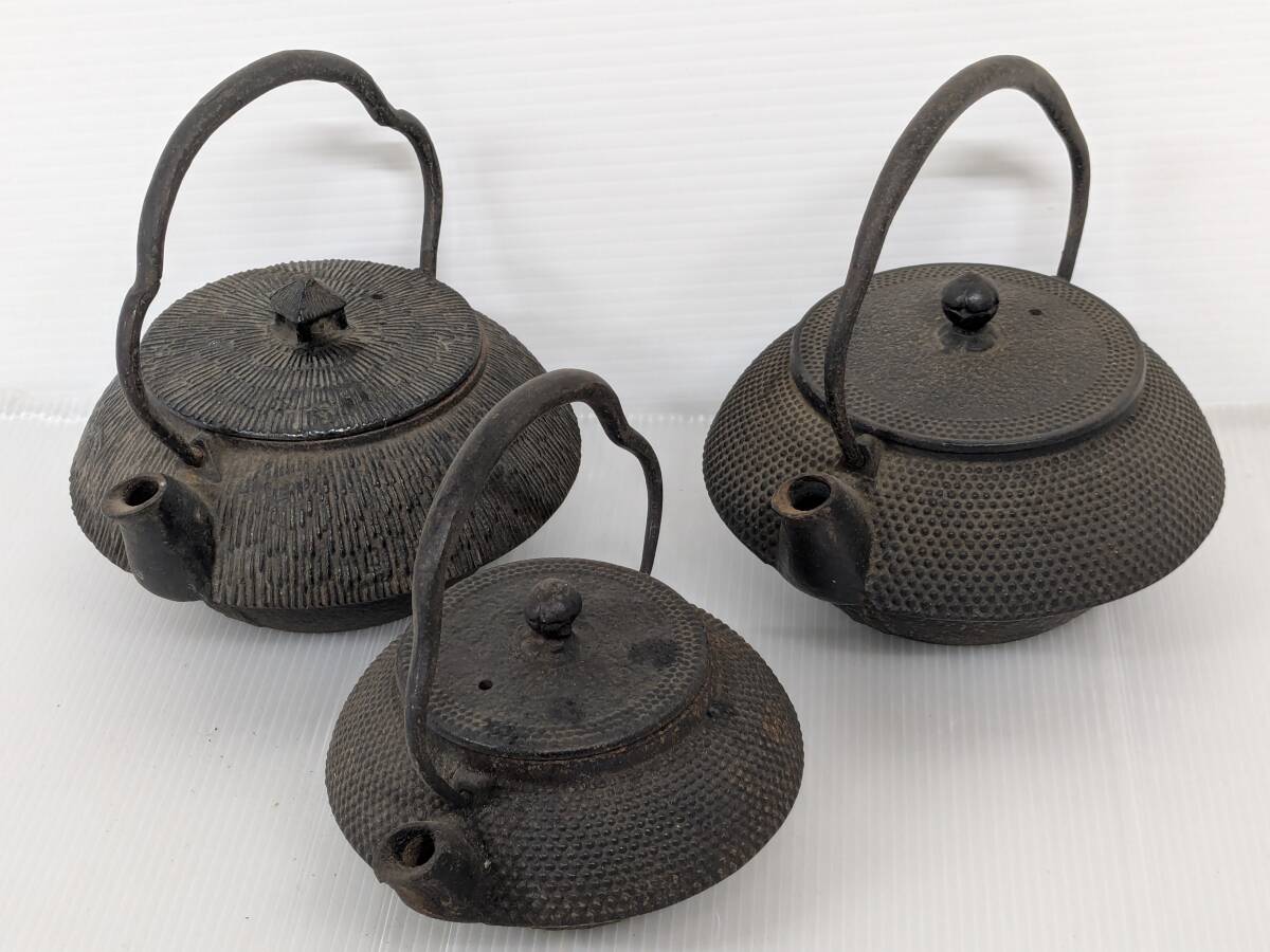 【 3点セット 】 南部鉄器 急須 岩鋳 鉄瓶 高さ 約15㎝ 約15㎝ 約12.5㎝ 取っ手含む 鉄製 茶器 茶道具 煎茶道具 鉄器 茶瓶 工芸品 (☆40)