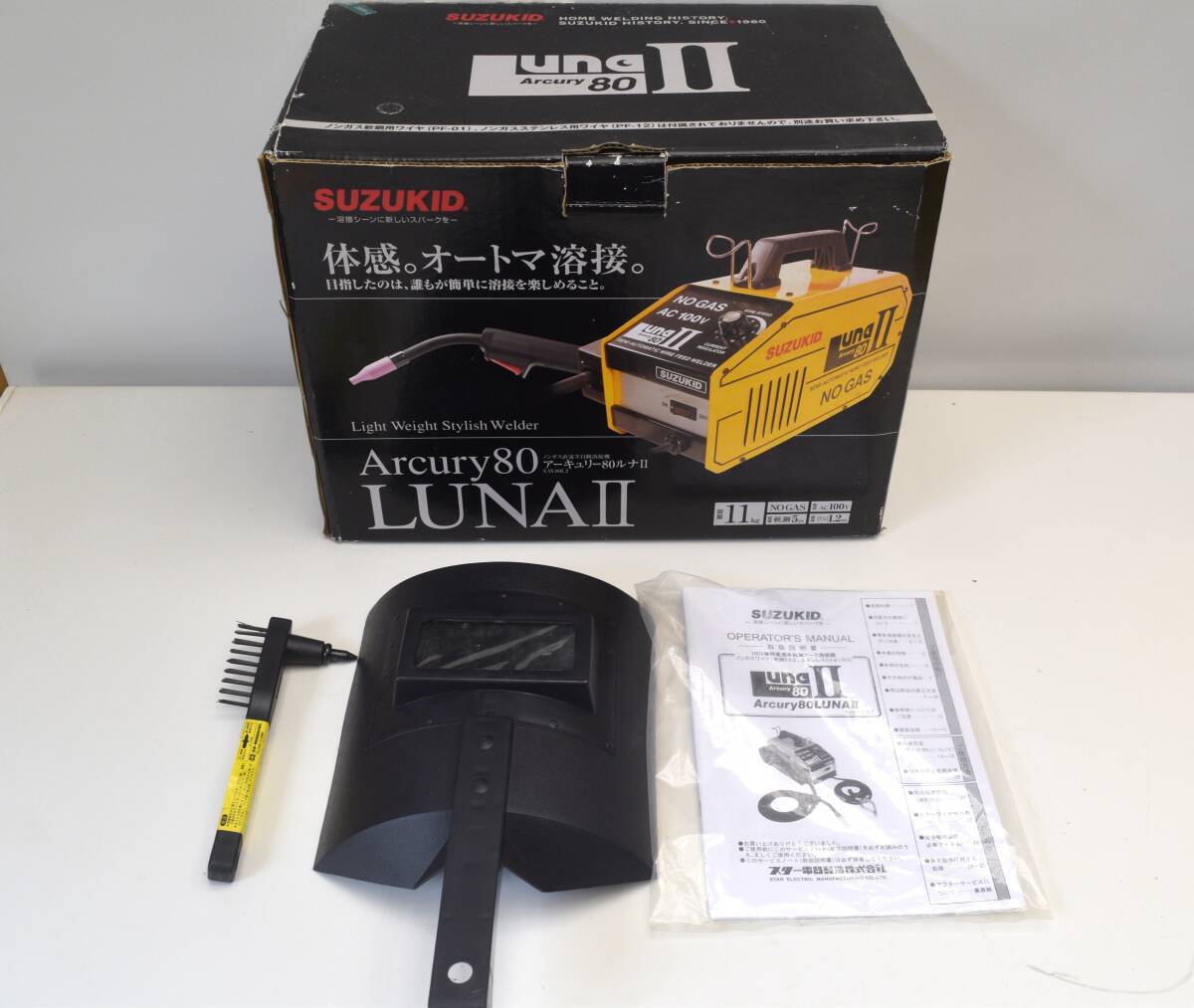 本体・手持ち遮光面・ワイヤブラシ・取扱説明書・元箱(緩衝材なし)です。