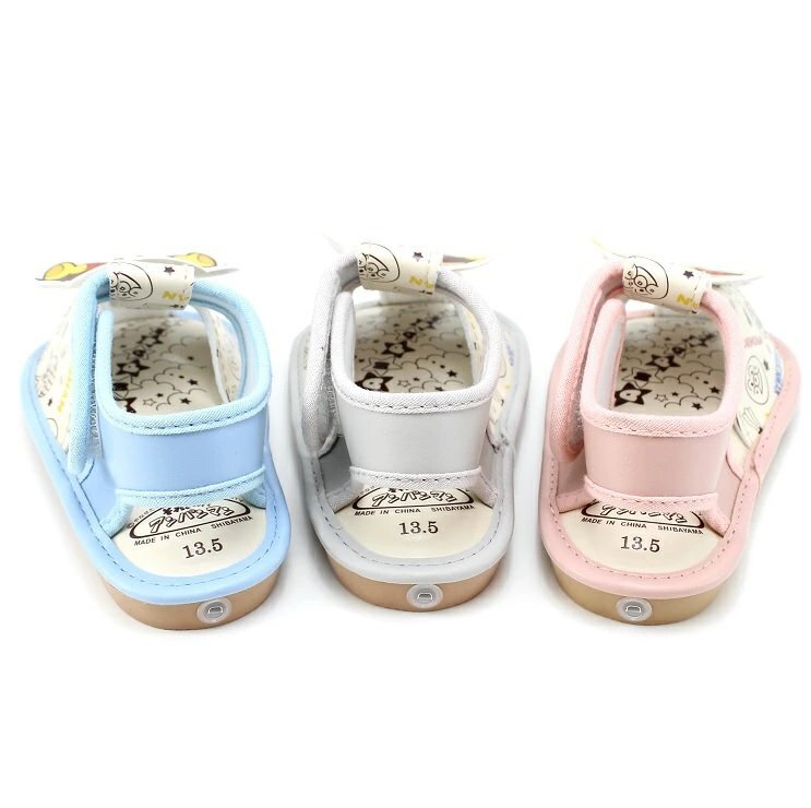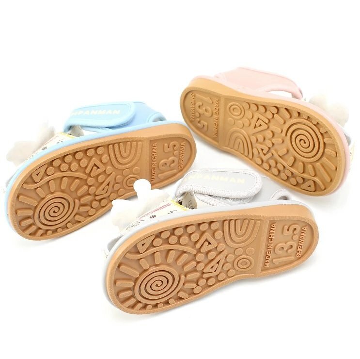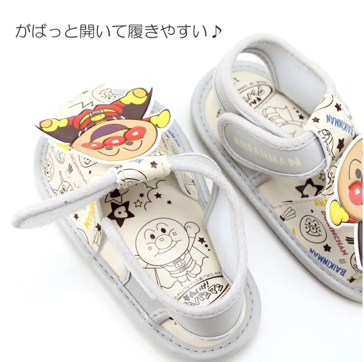 | 大人気「アンパンマン」のベビーサマーシューズです。 笛付きサンダルで歩くたびにピッピッと音が鳴ります♪ ママ・パパにもうれしい、脱ぎ履きしやすい甲バンドタイプです。 お子様に快適に履いていただけるようソフトな作りになっています。 アンパンマンと愉快な仲間たちがプリントされています。 いろんなお洋服に合わせやすい、くすみカラーが可愛い★☆ | |