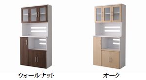| 【ポイント】 ①省スペースで食器や小物、家電まで収納できる大容量の食器棚です。 ②ミストガラスとツートンカラーがオシャレなデザインです。 ③家電を利用しやすい、2口コンセント付きカウンターです。 ④出し入れラクラク、スライドトレー付きです。 ⑤扉収納の中には高さを調節できる可動棚付きです。 ⑥落ち着いた木目調のオークとウォールナットカラーからの2色展開です。 |