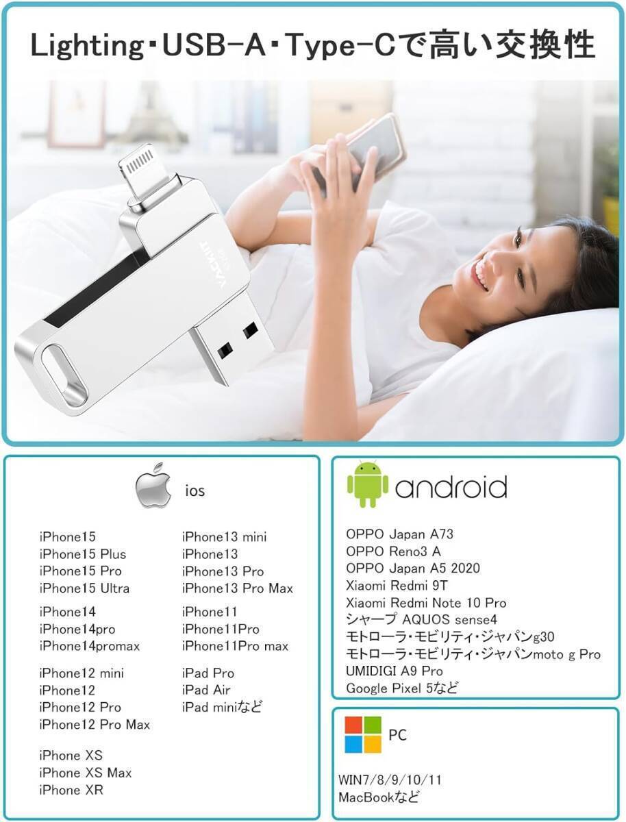 この商品について「安心して使えるMFI認証iPhone usbメモリ」当社のusbメモリはApple社のMFi認証取得を取得、認証番号。Made for iphone/ipad認証Lightning USBメモリは安定したデータ通信が可能で 、IOSを最新版にアップデートしても、引き続き使用出来ます。「3 IN 1 人気のランキングusb メモリiphone」当社のUSBメモリ・フラッシュドライブはlightning・usb-A ・type-c 3つの端子がつきので、iphone iPad iPod/Win Macではなく、Androidでも使用可能で、デバイスの間、データ転送が楽々!更に、当社のUSBメモリはUSB3.0対応でUSB2.0より性能アップさせ、高速なデータ転送を実現、大容量のデータや写真・ビデオも短時間で転送可能です。「スマホ容量対策のUSBメモリ・フラッシュドライブ」本スマホ USBメモは超軽量でコンパクトなスタイリッシュボディ、そしてキャップレスの360°回転式デザインで、どこにでも持ち運べます。スマホで撮った写真をフラッシュドライブに保存したい時、会議資料を素早く共有したい時、wifiとパソコンがない場合など便利で、旅行・通勤・会議に最適なiphone usbです。「大容量usbメモリ・幅広い交換性アイフォンusbメモリ 」128GB のiPhone USBメモリでストレージを拡張でき、iOS デバイスを容量不足から徹底的解放させます!更に、すべてのiPhoneおよびiPadシリーズと互換性があります。iPhone14/14 pro /14 Pro MaxiPhone 13 /13 Pro/13 Pro Max/13 mini/iPhone 12 /12 Pro/12 Pro Max/12 mini/ 11 /11 Pro/11 Pro Max / SE (第2/1世代) /X /XS/XS Max /XR/8 Plus/8 / 7 Plus/7 /6s Plus/6s/6 6 Plus /Pad Pro / iPod touch 6/ MacBook Air/Macbook Pro/ iMac/PC /ノートパソコンなどのデバイスに対応します。