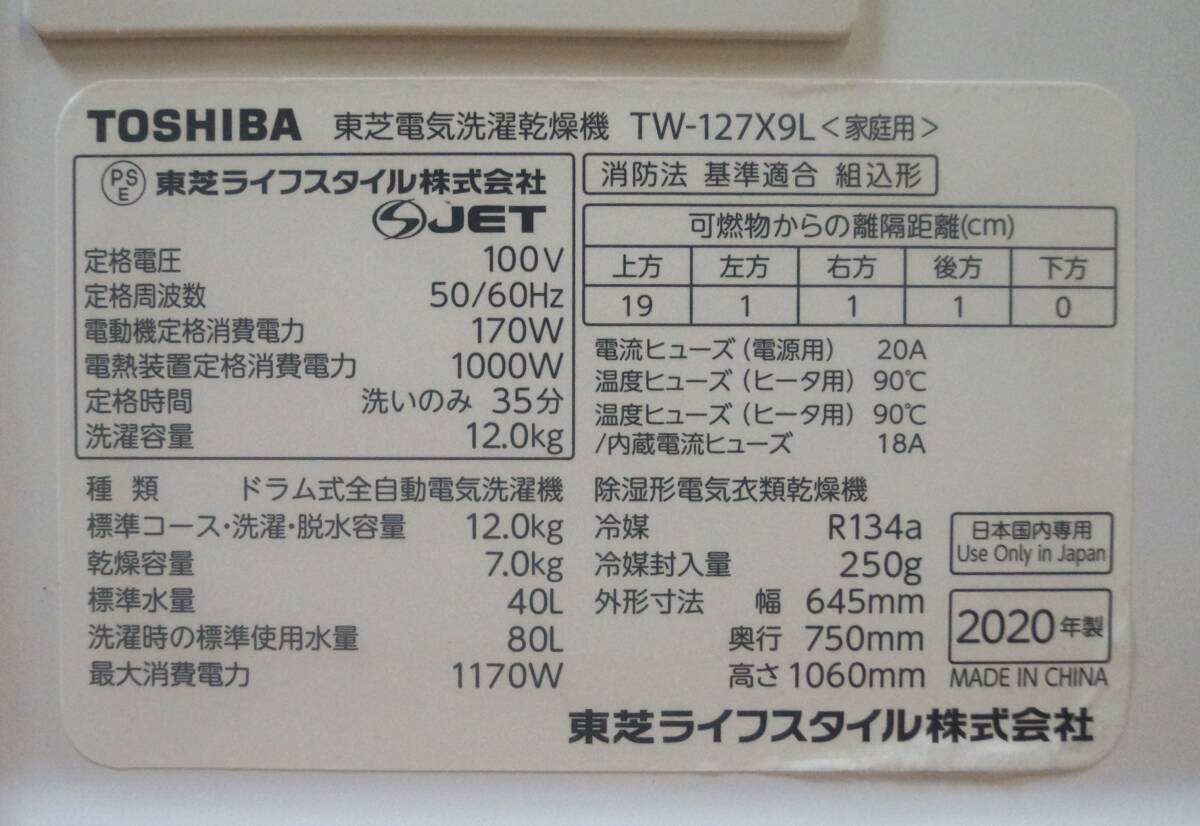 【東芝】TOSHIBA ドラム洗濯乾燥機 ZABOON TW-127X9L 左開き 洗濯12kg 乾燥7kg 2020年 (F3)
