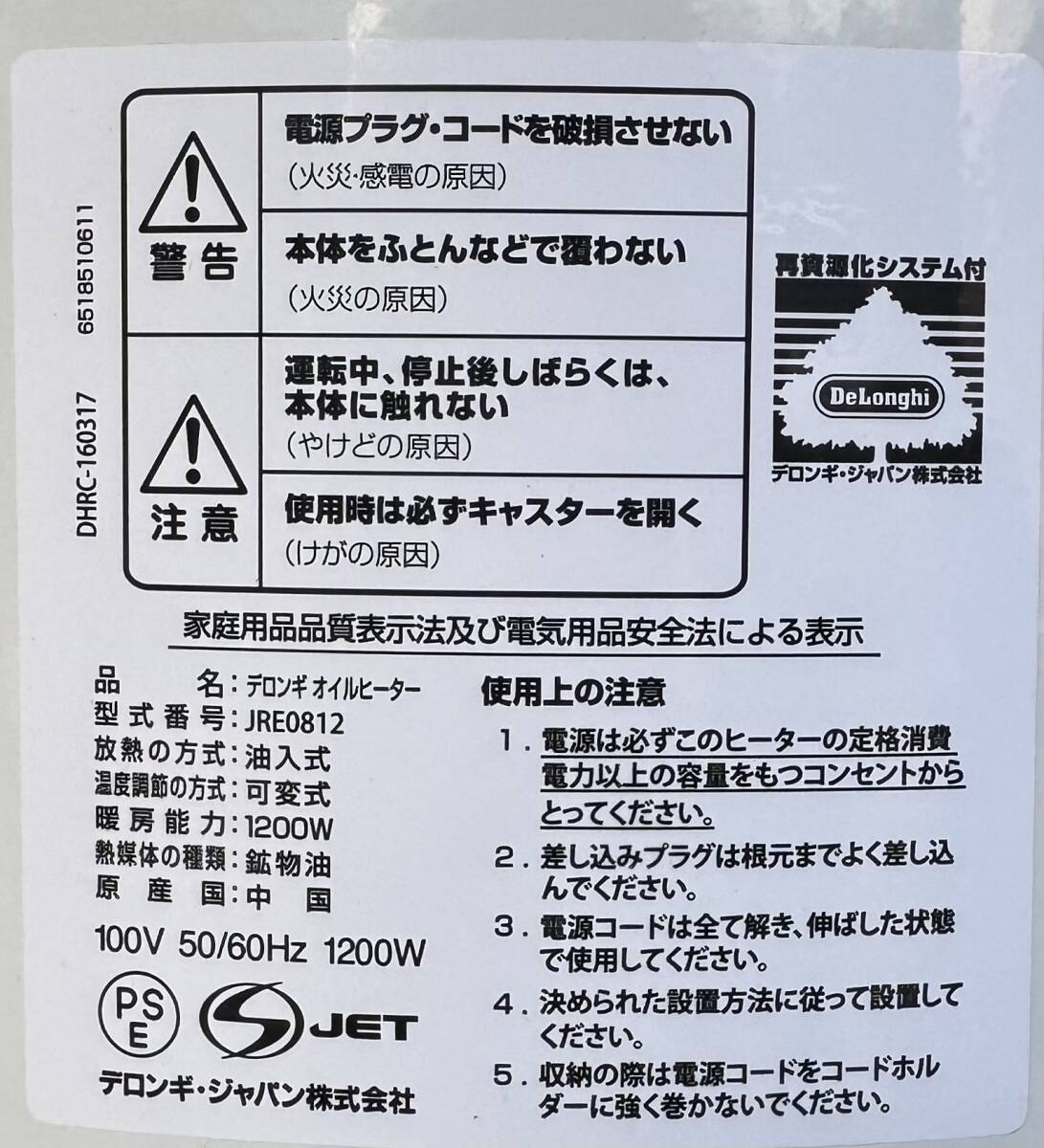 美品 DeLonghi デロンギ オイルヒーター JRE0812 1200W 8枚 暖房器具 元箱, 共布