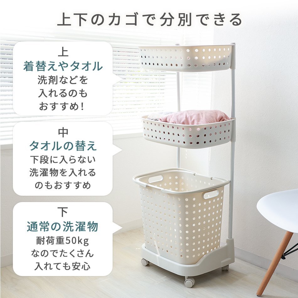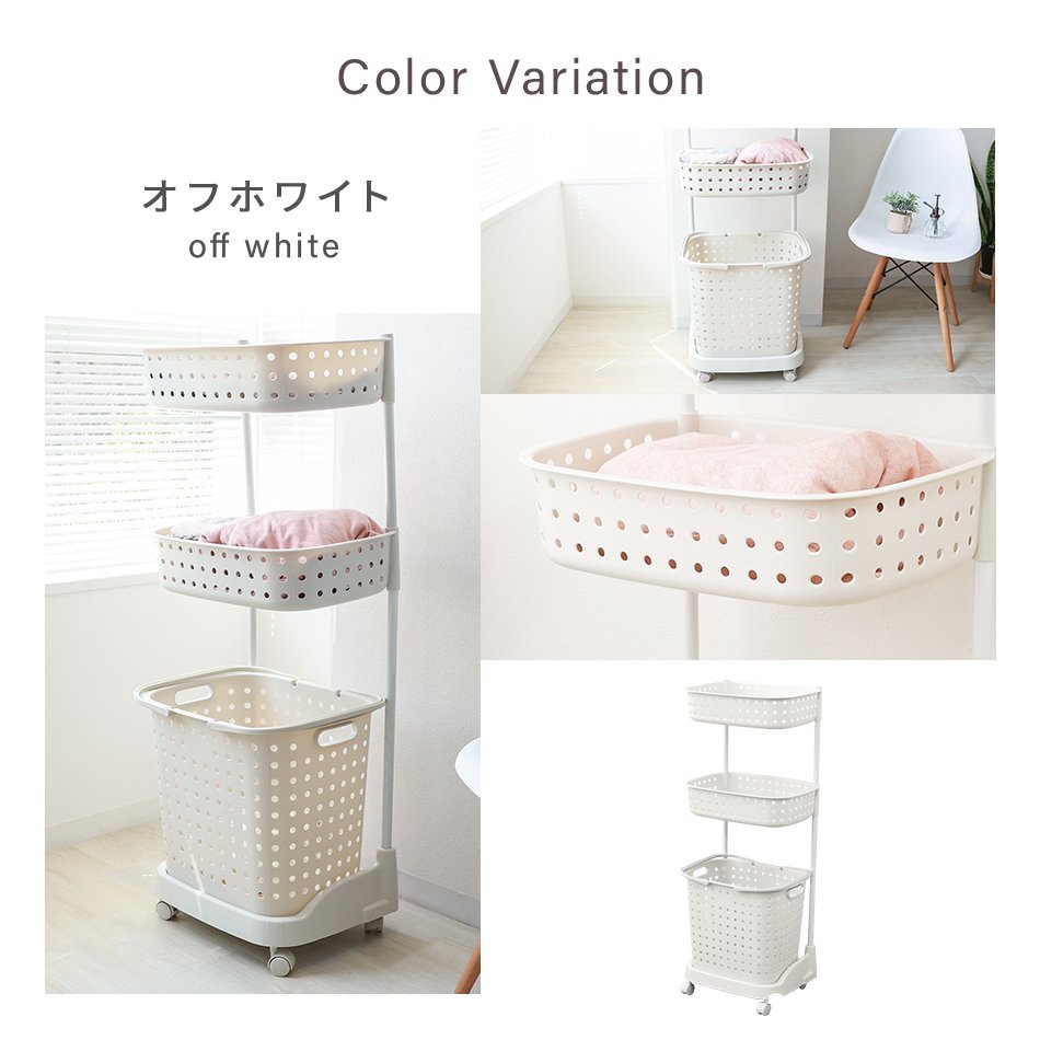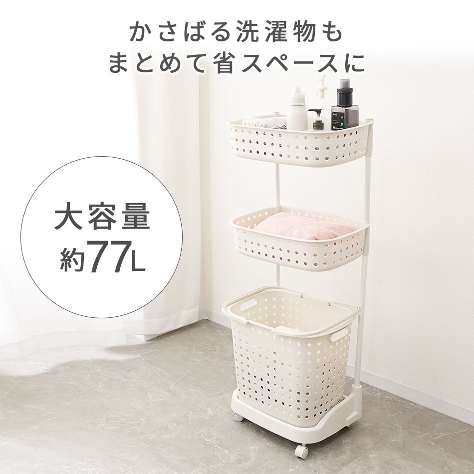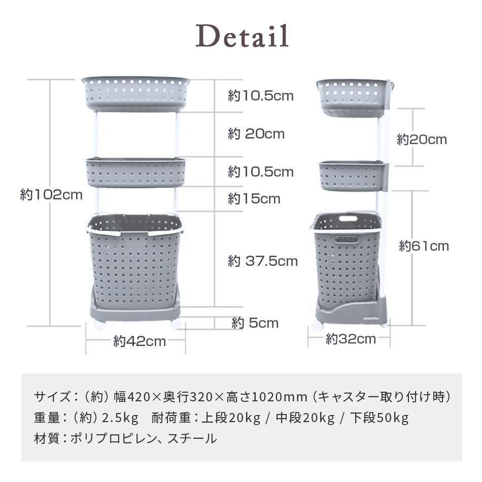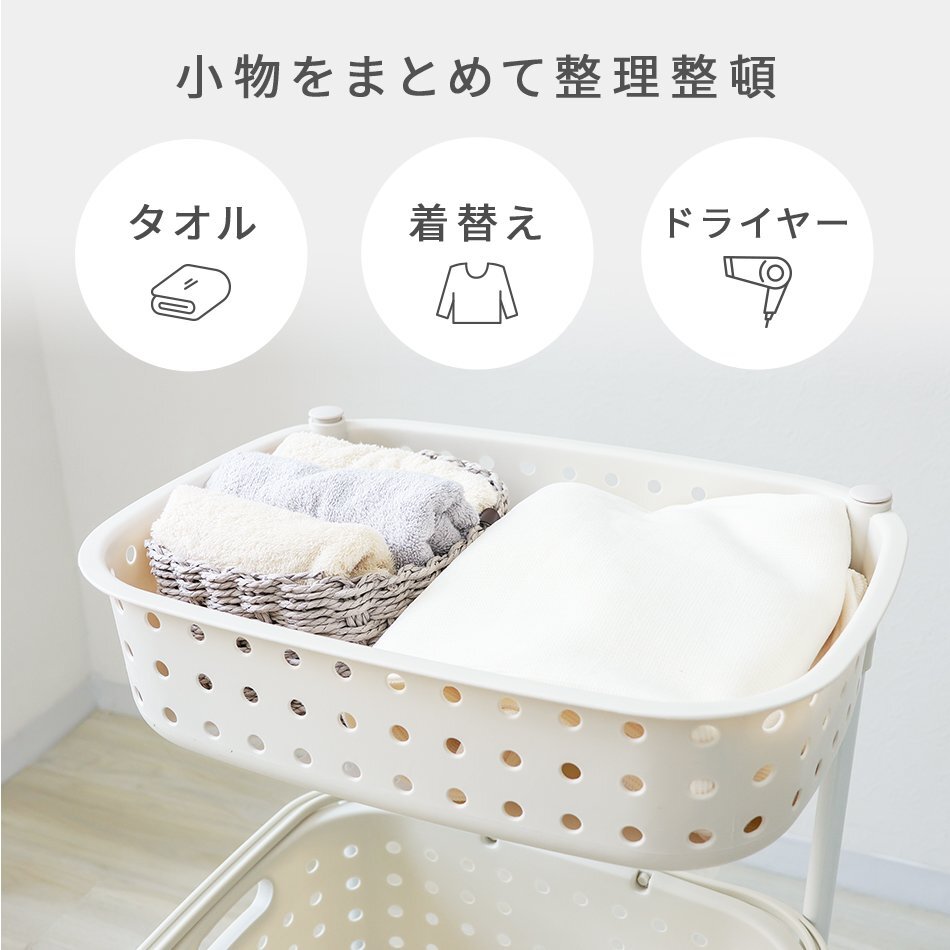 サニタリースペースをすっきり出来ます。 上段の浅バスケットにはバス用品、洗濯機まわりの小物が収納できます。 入浴時の着替えや脱衣カゴとしても重宝します。 下段のバスケットは大容量の深型タイプ!洗濯物干し場までの移動に便利なハンドル付き。 移動に便利なキャスター付きです。 【商品仕様】 カラー:オフホワイト サイズ(約):幅420×奥行320×高さ1020mm(キャスター取り付け時) 重量(約):2.5kg 容量(約):77L 材質:ポリプロピレン、スチール 組立式 |