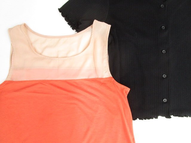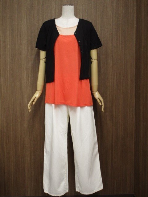 洗える半袖カーディガン+ノースリーブカットソー+ワイドパンツ コーディネート上下3点セット L相当 ブラック/オレンジ×ペールオレンジ/オフホワイト シンプル・カジュアル系 20代~30代~