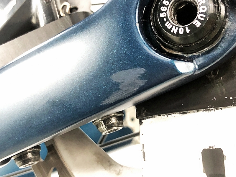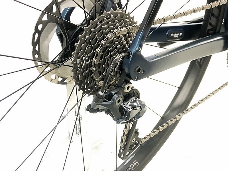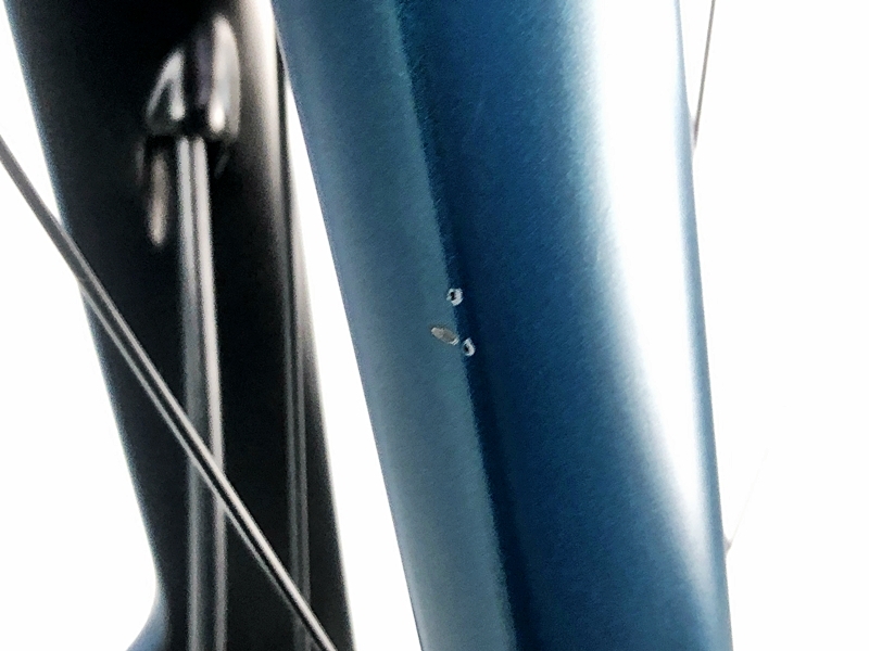 フレーム、その他外観:ダウンチューブ右に下手なタッチアップ跡があります。右チェーンステー下、左フレームエンド、シートポストクランプ周り、右フロントフォーク、クランク、リアディレイラー、STIレバー、ホイール、シートポスト、バーテープにキズがあります。ホイールハンドル、ステムに小キズがあります。