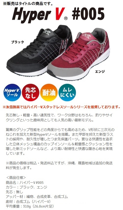 日進ゴムNISSHIN RUBBER先芯無し作業用スニーカー HyperV#005 エンジサイズ:26.5cm■特長<日本テレビ #博士は今日も嫉妬する 2022年10月9日>にて紹介されたモデルです。<フジテレビ" #逃走中 ">にて使用されているモデルです。< #世界の果てまでイッテQ!イモト日本ツアーin岡山県 2020年12月16日>で紹介されたモデルです。先芯無し・軽量・高い通気性で、ワーク分野はもちろん、釣りやサイクリングといった趣味用としても人気の高い最新モデル。驚異のグリップ性能をどの角度からでも高めるため、V形状に三次元のねじれを加えた新型HyperVソールを搭載。また甲部を抑えた新型ラストの採用や、耐久性が増したつま先保護パーツ。更なる快適性を追求した立体メッシュ構造のカップインソール&軽量感とクッション性を増した新ミッドソールなど、より高い耐滑性と快適な履き心地を実現しています。■商品仕様・カラー:ブラック・先芯:無し・アッパー材:編物、合成皮革、合成ゴム・底材:合成ゴム(ハイパーV)・平均重量:310g(※26.0cm片足)※氷雪路面ではハイパーVスタッドレスソールシリーズを推奨しております。