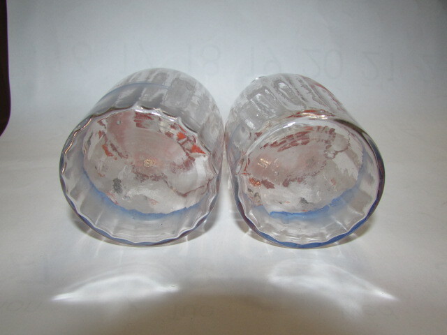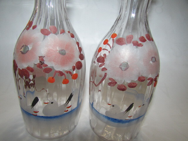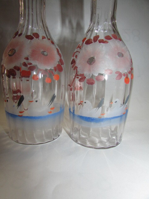 ( 会津若松・旧家・蔵出し)明治時代―大正時代( 古い時代の味わいのあるガラス徳利1対・手描き鳥と桜模様 )・貴重・珍品