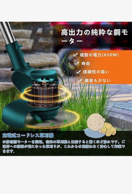 【強力&低騒音&そして簡単操作】8000回/分の高速回転のモーターを搭載しますので、強力で草刈の効率を大幅に向上させます。1充電あたりの連続運転時間(無負荷時)約45分。このモーターは低反動物理原理に基づき、作動時の振動軽減を通じてモーターの作動音を軽減し、低騒音が実現します。住宅地で草刈り中、近所にご迷惑をかけない。低騒音だけではなく、手も痺れにくい。ラクラクに雑草を刈り取り!