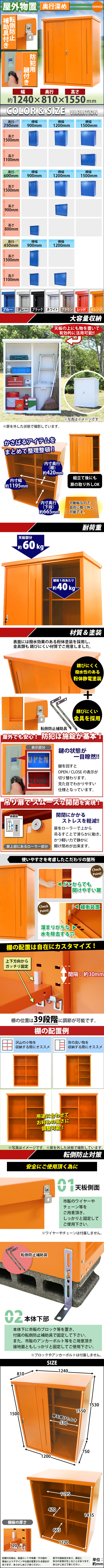 | 商品名 | 送料無料 屋外物置 スチール製 家庭用収納庫 鍵付き オレンジ 幅約1240mm×奥行約810mm×高さ約1550mm 倉庫 納屋 物置き スチール物置 スチール収納庫 ガレージ 収納 可動棚 吊り戸 吊戸 吊り扉 上吊り 吊引き戸 庭 ガーデン monookishw12d75h15or |