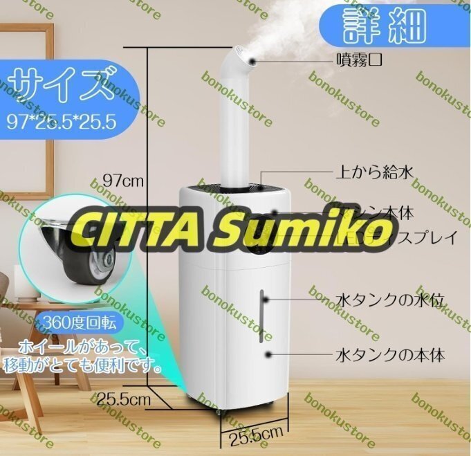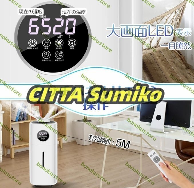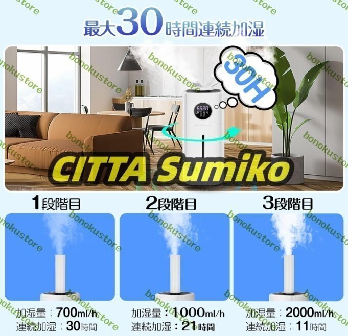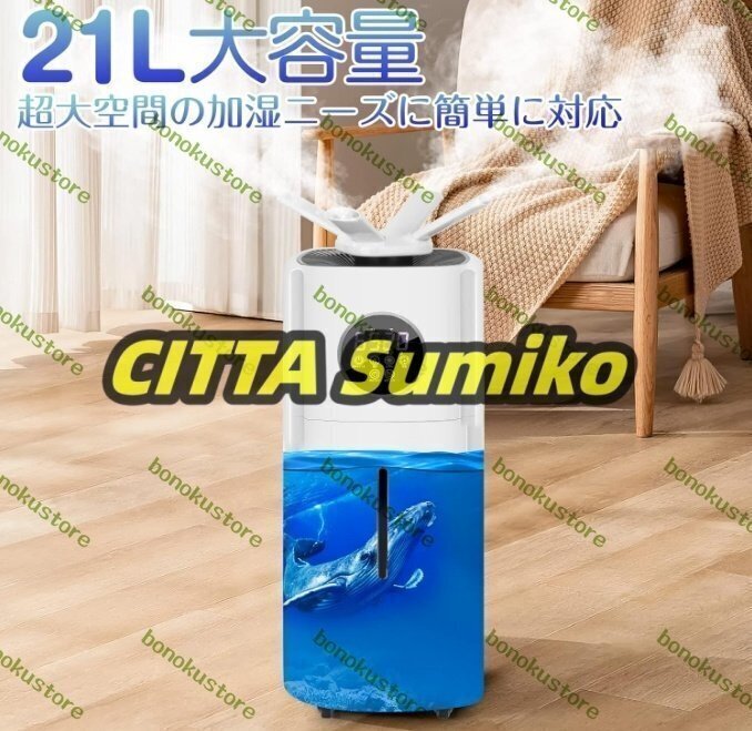 仕様:定格容量:21L稼働時間:30時間タイマー:1~12時間リモコン距離:約3-5メートル加湿力:3速ミスト量調整、1段階目700ML/H、2段階目1000ML/H、3段階目2000ML/H定格出力:110WUV除菌機能:UVランプ除菌機能サポート恒湿機能:65%恒湿機能サポート適応床面積: 木造和室20畳