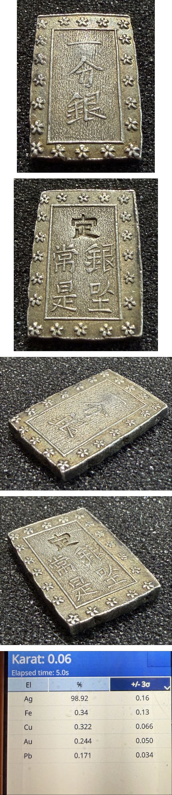 | 商品説明 | 【商品内容】 【本座 天保一分銀 Po 】 【品位】 銀98.92% 金0.244% OLYMPUS VANTA 蛍光X線分析計機 (約400万円)で測定。 鑑定結果は写真に掲載しています。 【量目】:8.63g 【状態】: 銀座オークションにて落札した一分銀です。 【本座 天保一分銀 Po 】となります。 コンディションは写真でご判断ください。 現状で気に入っていただける方のみお願い致します。 計量器は安価な物ですので多少の誤差はあると思います。 発送は【おてがる配送ゆうパケットポスト】を選んでいただき コインホルダーに入れ、プチプチに包み さらにプチプチ付き封筒に入れて発送いたします。 ◆あくまで個人保管品です。 画像にてご判断いただき、ご納得いただける方のみご入札をお願い致します。 また画像には限りがございますので、色味が異なる場合などあるかもしれません。 詳細部分にこだわる方、完璧をお求めになる方、状態に神経質な方もご遠慮願います。 商品状態に関しては個人差がございます。 落札後の商品状態による返品や故障時の補償は一切お断りいたします。 (すり替え防止の為) ◆不要なトラブルを避けるため、3日以内のご決済、 速やかな受け取り連絡をお守り頂ける方のみとしております。 あらかじめご了承ください。 お守り頂けなかった場合、落札者都合キャンセルとさせていただきます。 以上、全てをご了解いただける方のみご入札をお願い致します。 ■新規の方及び、評価が低い方の入札は取り消させていただく場合がございます。 ■領収証の発行は対応しておりません。 |