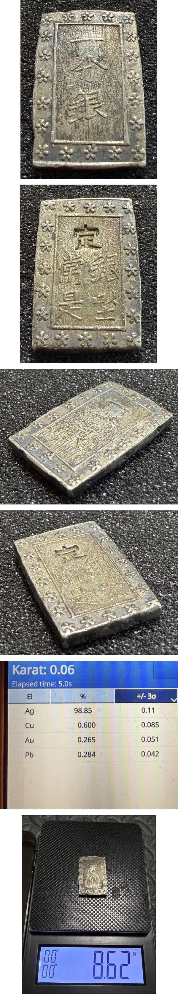| 商品説明 | 【商品内容】 【本座 天保一分銀 Ps 】 【品位】 銀98.85% 金0.265% OLYMPUS VANTA 蛍光X線分析計機 (約400万円)で測定。 鑑定結果は写真に掲載しています。 【量目】:8.62g 【状態】: 銀座オークションにて落札した一分銀です。 【本座 天保一分銀 Ps 】となります。 コンディションは写真でご判断ください。 現状で気に入っていただける方のみお願い致します。 計量器は安価な物ですので多少の誤差はあると思います。 発送は【おてがる配送ゆうパケットポスト】を選んでいただき コインホルダーに入れ、プチプチに包み さらにプチプチ付き封筒に入れて発送いたします。 ◆あくまで個人保管品です。 画像にてご判断いただき、ご納得いただける方のみご入札をお願い致します。 また画像には限りがございますので、色味が異なる場合などあるかもしれません。 詳細部分にこだわる方、完璧をお求めになる方、状態に神経質な方もご遠慮願います。 商品状態に関しては個人差がございます。 落札後の商品状態による返品や故障時の補償は一切お断りいたします。 (すり替え防止の為) ◆不要なトラブルを避けるため、3日以内のご決済、 速やかな受け取り連絡をお守り頂ける方のみとしております。 あらかじめご了承ください。 お守り頂けなかった場合、落札者都合キャンセルとさせていただきます。 以上、全てをご了解いただける方のみご入札をお願い致します。 ■新規の方及び、評価が低い方の入札は取り消させていただく場合がございます。 ■領収証の発行は対応しておりません。 |