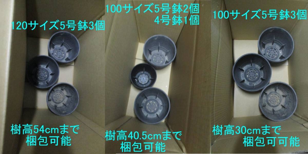 ※送料込み商品をヤフオクで複数ご落札後におまとめ発送のご依頼をされました場合、送料別商品でない限りシステム上、金額の欄を変更できませんので割引ができませんが、質問欄や当方のショップページのお問い合わせ欄よりセット販売のお問い合わせを頂けましたら、5号鉢苗2個で100サイズ、3個120サイズ、6個160サイズでの発送も可能(樹高によっては同梱が無理な場合もございます。)ですので、他の出品商品やご希望の品種などをご連絡頂けましたら、複数鉢を1梱包にした場合の総額をご連絡致しますので、ご判断いただけましたらヤフオクに専用出品致します。10枚目の写真は梱包の箱3種類の同梱発送の目安です、他にも箱がございますので複数をご検討されますお客様はいつでもお問い合わせください。