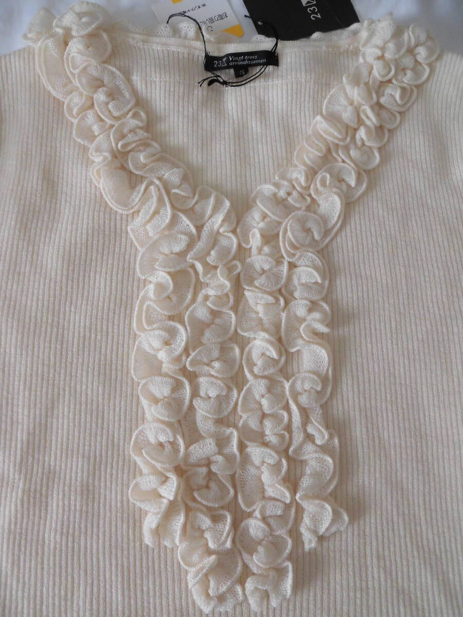 新品タグ付き 23区 フリルVネックニット オフホワイト サイズ46 大きいサイズ 毛100%