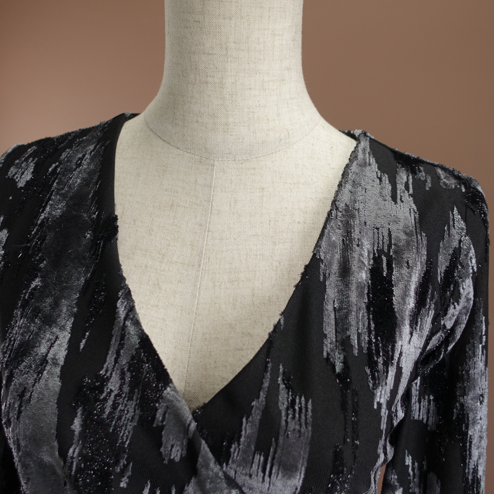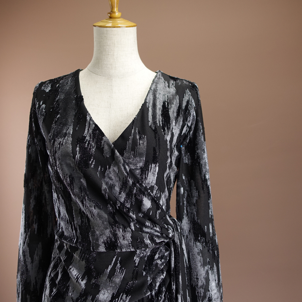 Vネック&ラップスタイルで、女性らしいデコルテラインを強調。