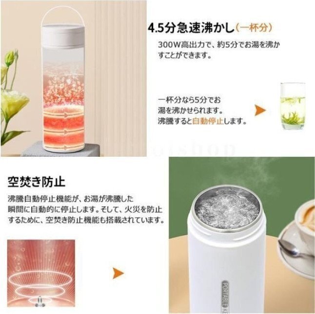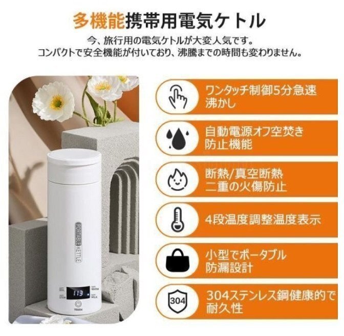 電気ケトル ポータブル 電気ポット 水筒 保温瓶 多機能 軽量 小型 500ml 漏れ防止 4段階温度設定 収納バッグ付 旅行 キャンプ