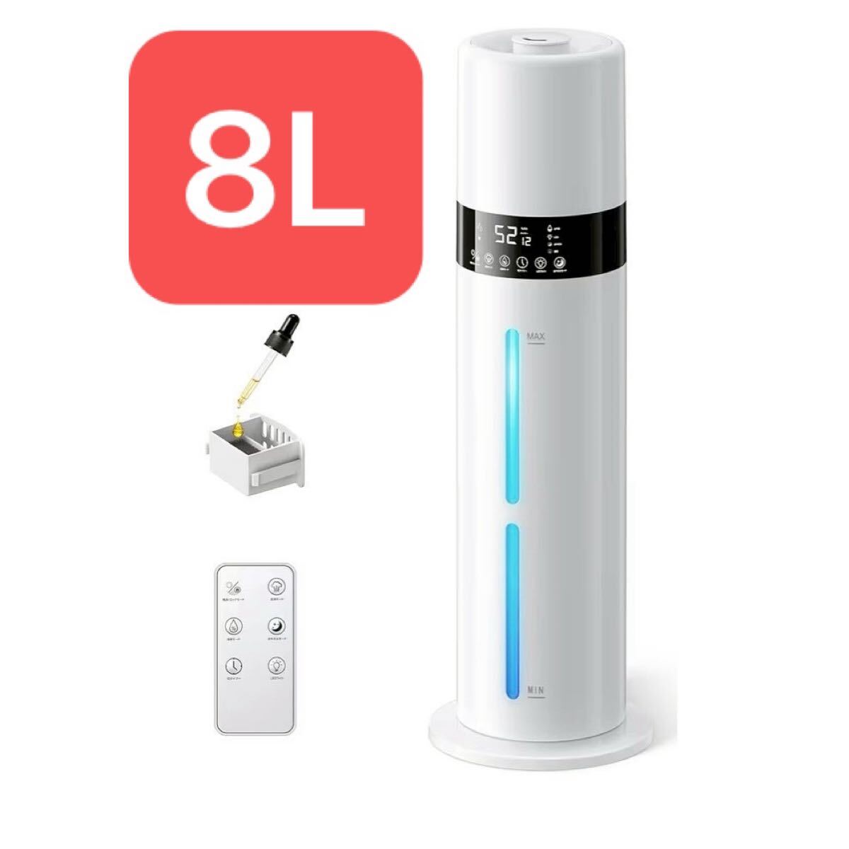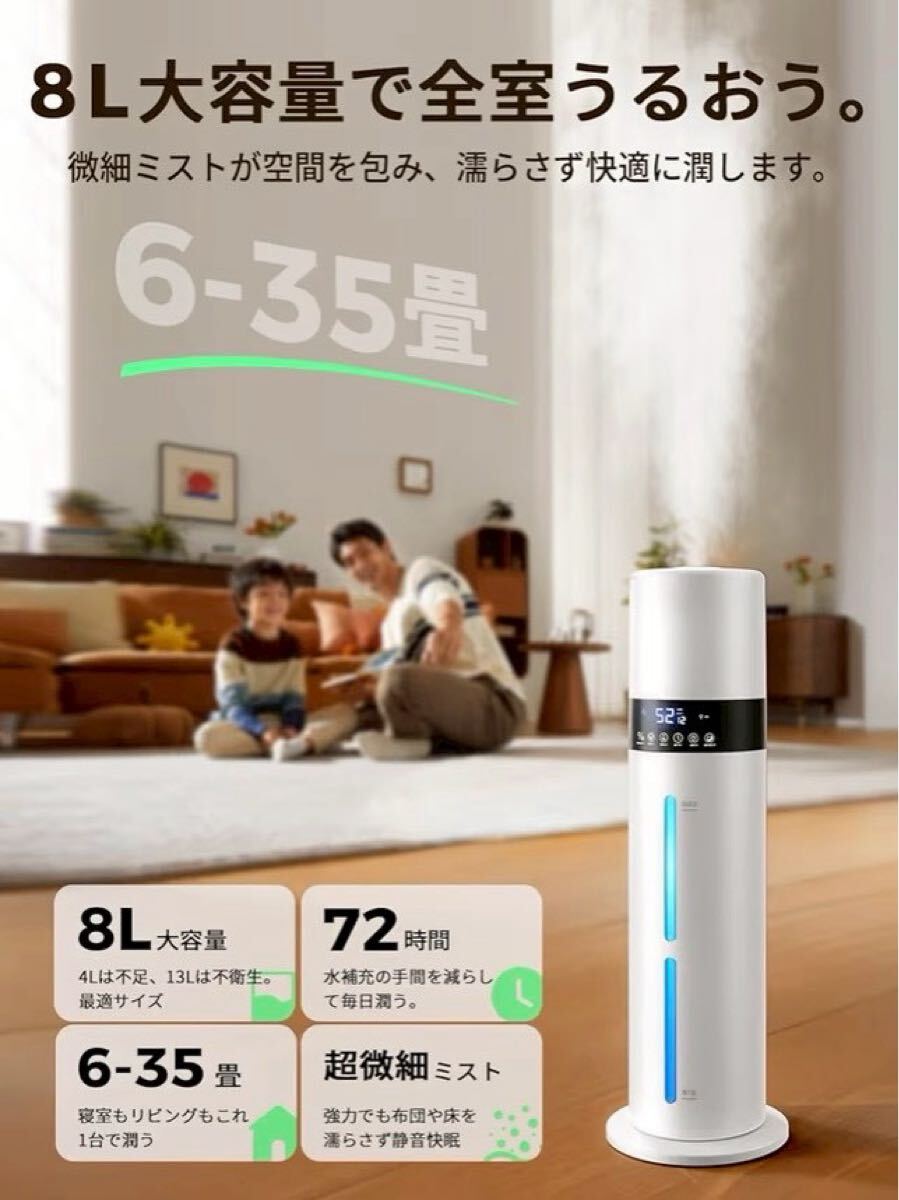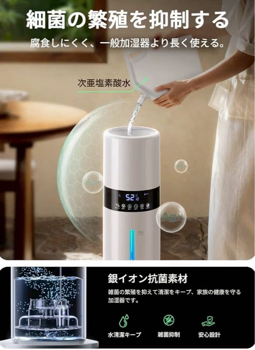 【8L大容量×銀イオン抗菌×静音設計】ついに登場!手間いらずで毎日を潤す次世代加湿器。上から水を注ぐだけの「上部給水式」で、重いタンクを持ち運ぶ必要なし!8Lの大容量で6〜35畳までしっかり加湿し、何度も給水する手間を軽減。雑菌の繁殖を防ぐ「銀イオン抗菌タンク」と「次亜塩素酸水対応」で、いつでも清潔なミストをお届け。お子さまやペットのいるご家庭でも安心です。さらに「自動湿度設定機能」で40〜90%までお好みの湿度を自由にコントロール。設定湿度に達すると自動停止し、空焚き防止機能も搭載しているため、外出時や就寝時も安心。動作音はわずか約24dB、スリープモードでランプも自動消灯、快適な眠りを妨げません。さらにアロマ対応&7色LEDライトで香りと光の癒し空間を演出。デザイン性にも優れ、リビング・寝室・オフィスなどあらゆる場所にマッチ。乾燥対策からリラックスタイムまで、これ1台で心も空間も潤うワンランク上の加湿器です。
