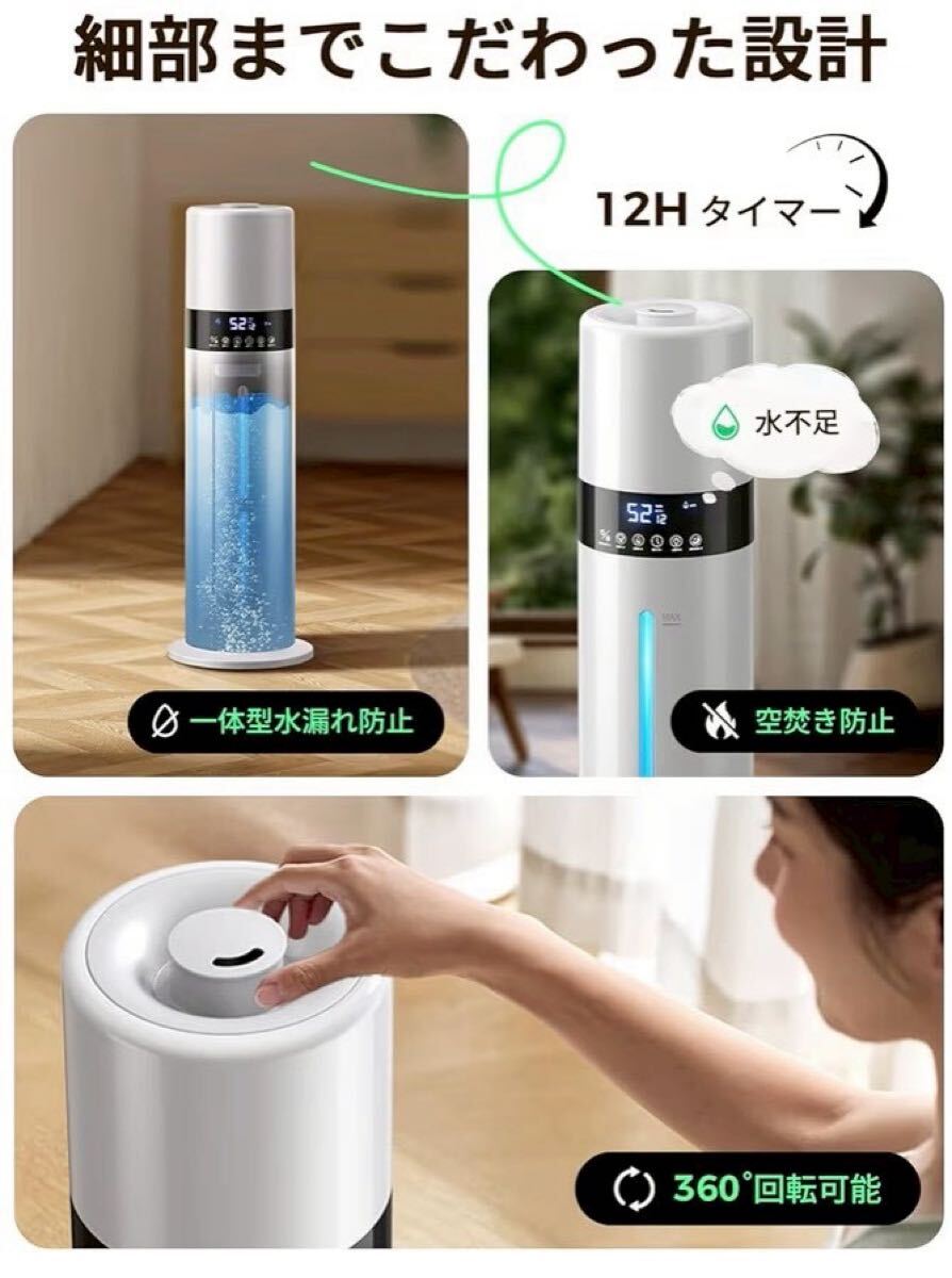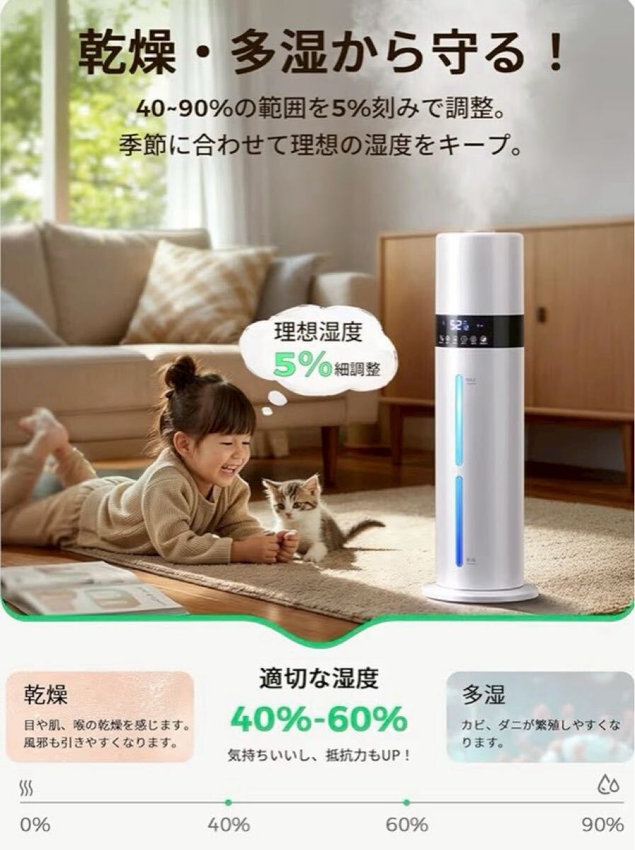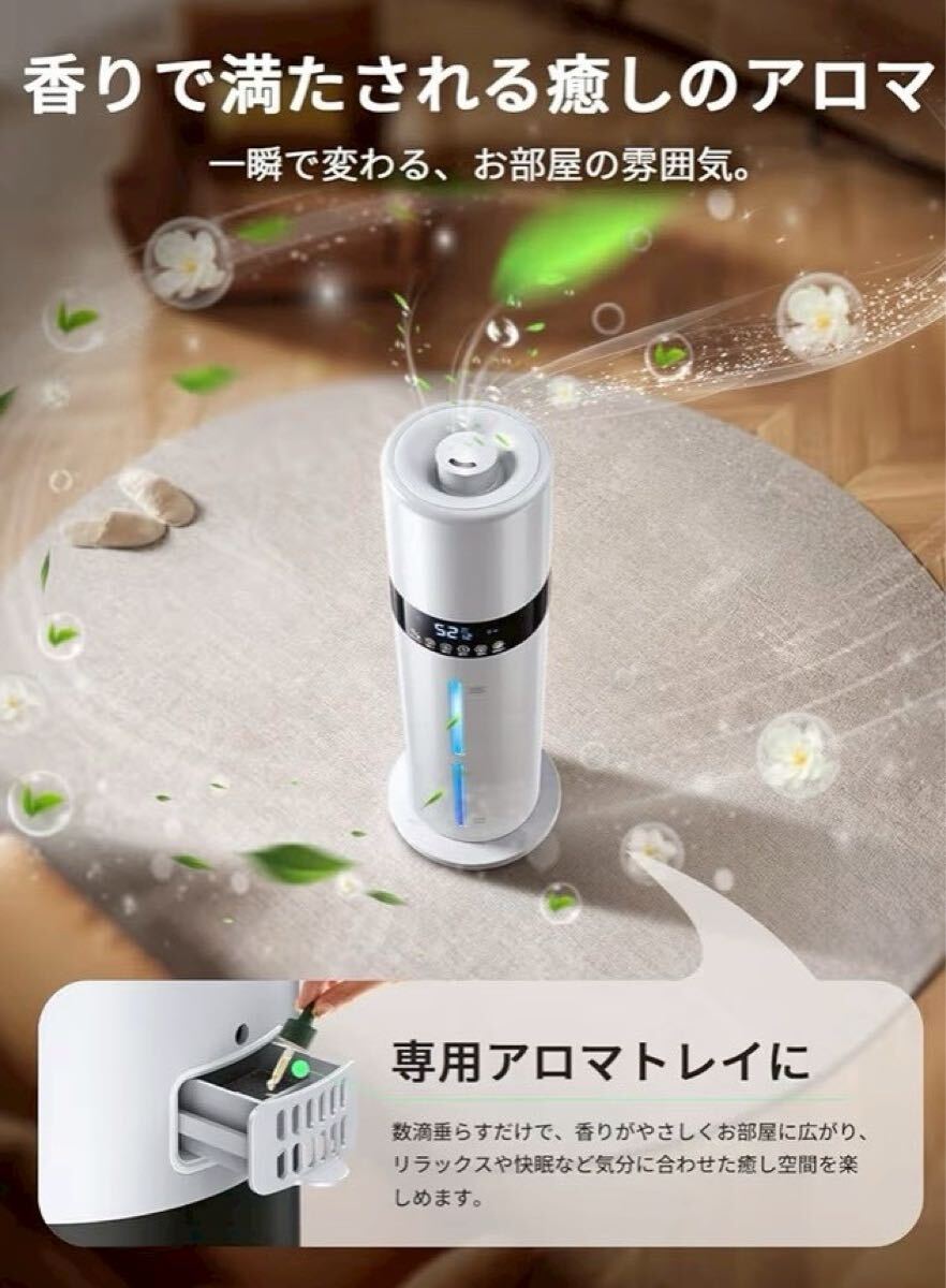 【8L大容量×銀イオン抗菌×静音設計】ついに登場!手間いらずで毎日を潤す次世代加湿器。上から水を注ぐだけの「上部給水式」で、重いタンクを持ち運ぶ必要なし!8Lの大容量で6〜35畳までしっかり加湿し、何度も給水する手間を軽減。雑菌の繁殖を防ぐ「銀イオン抗菌タンク」と「次亜塩素酸水対応」で、いつでも清潔なミストをお届け。お子さまやペットのいるご家庭でも安心です。さらに「自動湿度設定機能」で40〜90%までお好みの湿度を自由にコントロール。設定湿度に達すると自動停止し、空焚き防止機能も搭載しているため、外出時や就寝時も安心。動作音はわずか約24dB、スリープモードでランプも自動消灯、快適な眠りを妨げません。さらにアロマ対応&7色LEDライトで香りと光の癒し空間を演出。デザイン性にも優れ、リビング・寝室・オフィスなどあらゆる場所にマッチ。乾燥対策からリラックスタイムまで、これ1台で心も空間も潤うワンランク上の加湿器です。