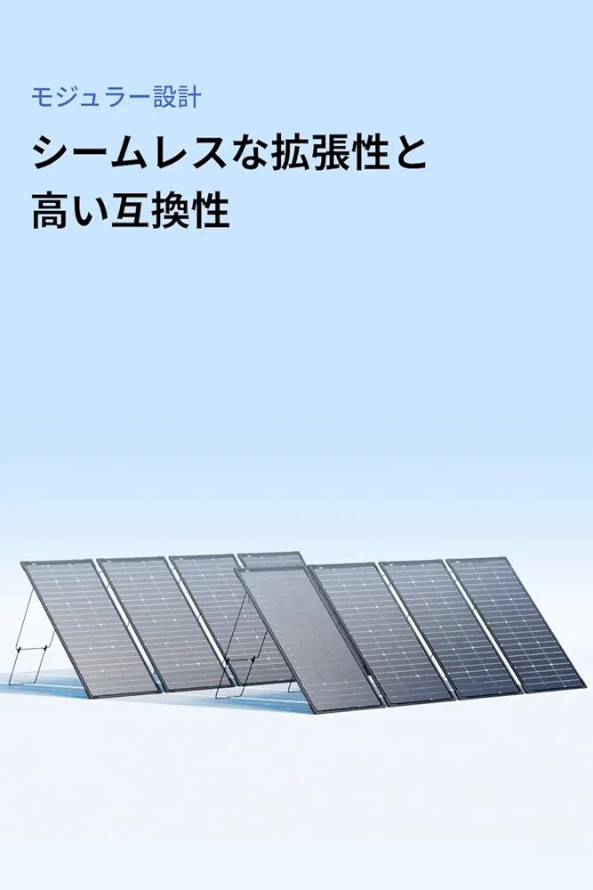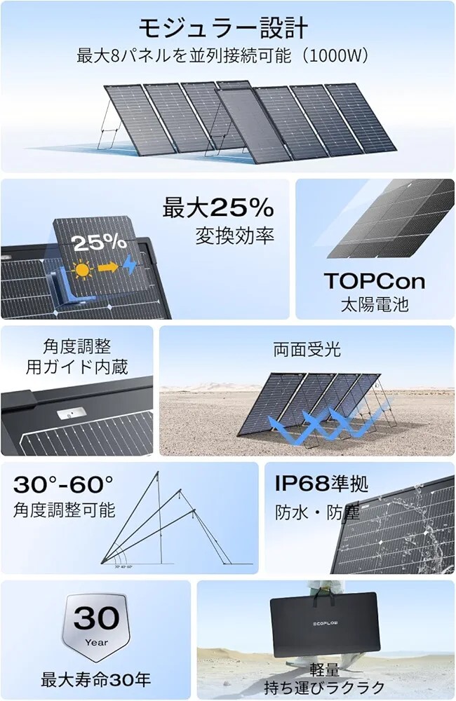 【モジュラー設計、シームレスな拡張性と高い互換性】革新的なモジュラー設計を採用したEcoFlow 125W両面ソーラーパネルは、125W、50V (Voc)、2.9A (STC) の出力を実現しています。安全な範囲内でシームレスに拡張でき、さまざまなEcoFlowポータブル電源に対応しています。