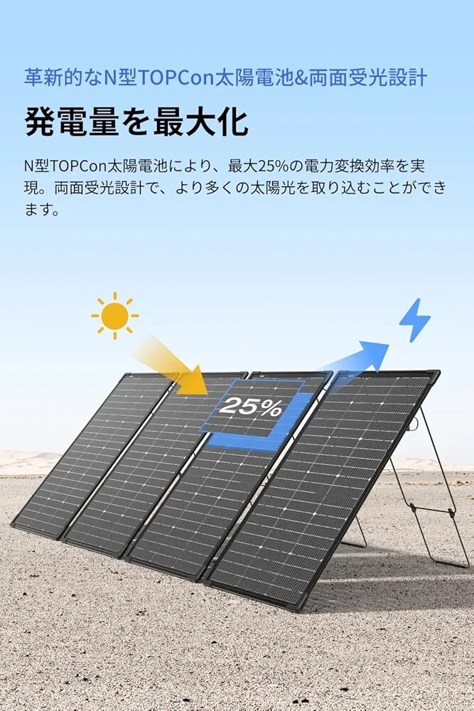 【発電量を最大化、革新的なN型ソーラーセル太陽電池&両面受光設計使用】N型ソーラーセル太陽電池により、最大25%の電力変換効率を実現。両面受光設計によって最大138Wの両面発電が可能で、より多くの太場光を取り込むことができます。