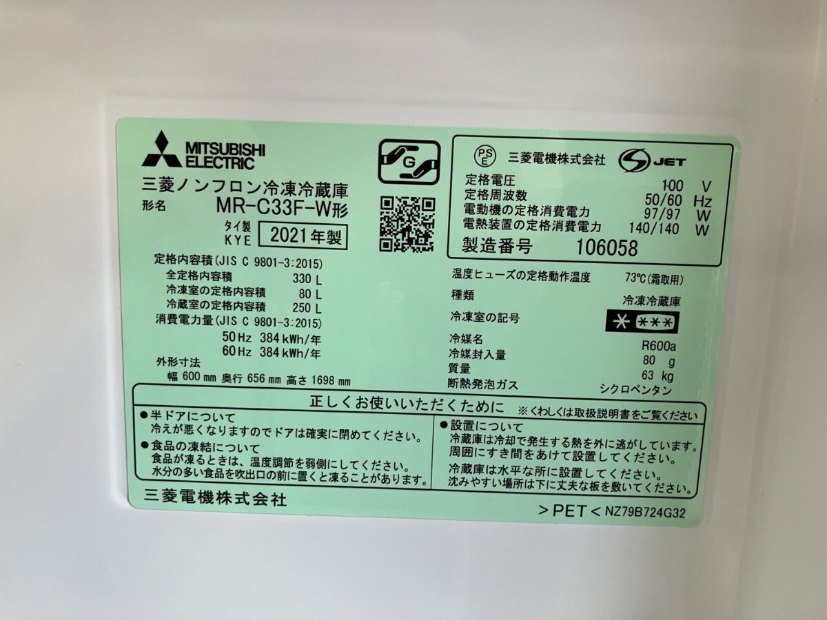 【中古】大阪引取限定 MITSUBISHI ELECTRIC MR-C33F-W 冷蔵庫 330L 2021年製【KSK1F018】 |
