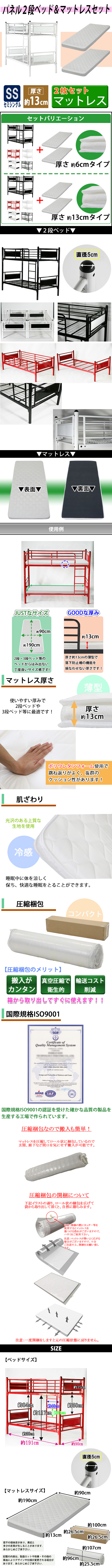 | 商品サイズ | 【本体外寸】 【2段ベッド】W約100x D約202x H約163(cm) 【マットレス】W約90×D約190×H約13(cm) 【梱包サイズ】 【2段ベッド】W約101×D約198×H約13(cm)/約52kg 【マットレス】W約26.5×D約26.5×H約100(cm)/約7.4kg 【マットレス】W約26.5×D約26.5×H約100(cm)/約7.4kg |