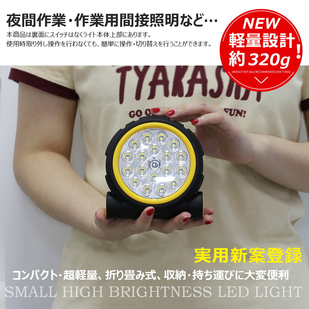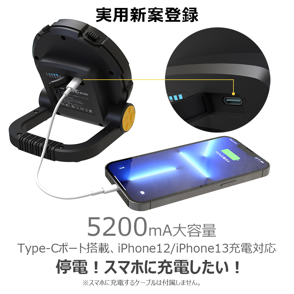 | ●大容量バッテリ・Type-C端子 内蔵電池は5200mA大容量です。 高速充電に対応できるType-C端子を採用し、USB充電電圧5V 1A/2Aです。iPhone12、iPhone13へ充電対応可能です。 充電式なので、電源の取れないところどこでもご利用可能です。 電池の残量指示ランプもついています。電池の管理・備えも簡単・安心! ●超軽量・高照度 軽量設計で、わずか320gです。 照明用LEDチップ18粒採用、ハイモードは2000lmがあります。 ●多様な使い方・超便利 ステーにマグネットが内蔵されているので、金属表明に貼り付けて使用可能です。作業点検などには最高です。 鉄素材にしっかり固定でき、壁や天井や車に貼り付けたり、夜間作業、自動車整備などで十分に役立てます。 可動式のステーで、照射角度も自由自在に設置できます。 ステーに吊り下げ穴もついているので、フックに吊るしたりします。 折りたたみ式スタンド・吊り下げ穴・マグネットによって、自立・壁掛け・据え置き・手持ちなど、多種多様な使用方法があります。 ●独立のフラッシュモードボタン 緊急時にもすぐ使える独立スイッチ式です!万が一何かあった場合でもボタン一つでほかモードからすぐに変更可能です。 点灯四パターン(サーチライト・HIGH-LOW、FLASH)、二つのボタンが設計されています。 FLASHモードを独自のスイッチで簡単にON/OFFに切り替えます。 スイッチはライトの裏面に設置することではなく、ライト本体上部にあります。おしゃれなデザインに工夫しています。 ●用途 夜間作業、自動車整備、アウトドア、駐車場、倉庫照明、停電対策、災害対策、 キャンプ、夜釣り、山登り、散歩、夜間警備、防犯、護身用時に大活躍しています。 |