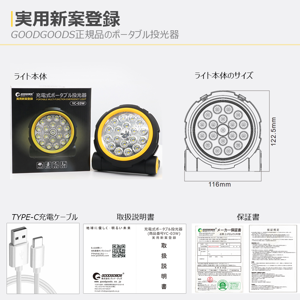 | 本体のサイズ | 122.5*116*47mm | セット内容 | ライト本体、TYPE-C充電ケーブル、保証書、 取扱説明書、 |